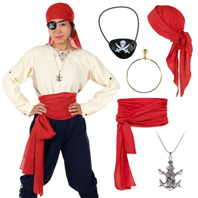 • Piraten Kostüm Set mit Kopftuch, Schärpe, Augenklappe & Kette | versch. Farben