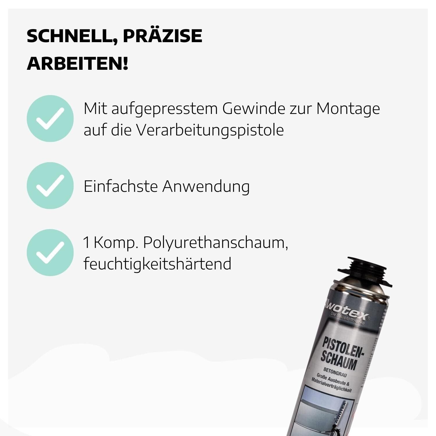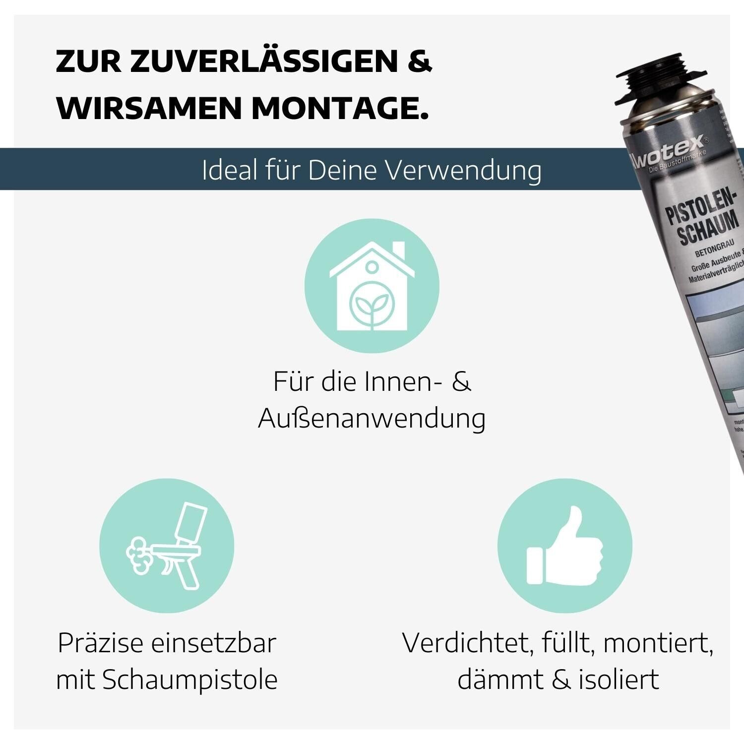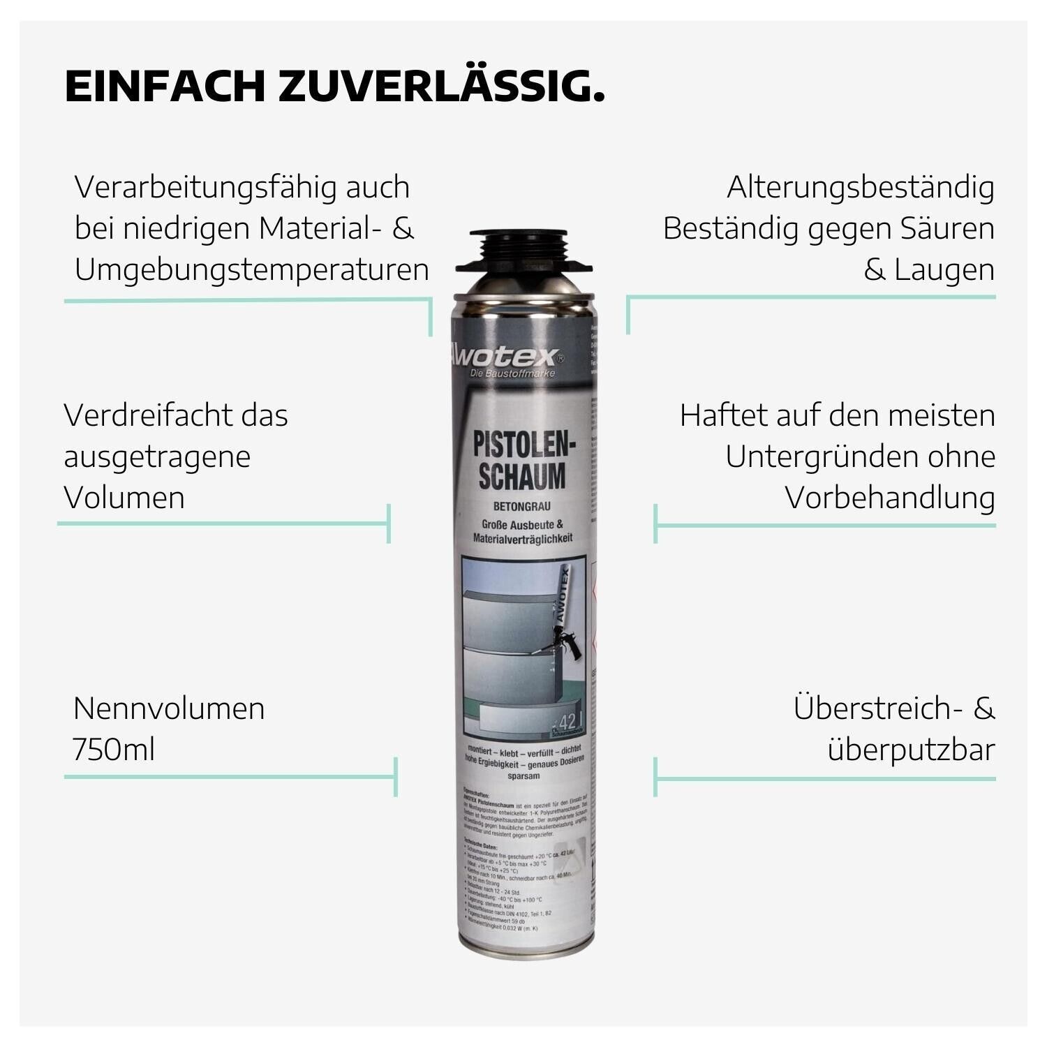 Dieser Pistolenschaum in Betongrau eignet sich perfekt für den Einsatz im Bau- und Montagebereich. Hergestellt in Deutschland und ausgestattet mit einem Volumen von 750 ml pro Dose, kommt dieser PU-Schaum im praktischen Set mit 12 Dosen. Seine Verarbeitungstemperatur liegt zwischen 5°C und 30°C und
