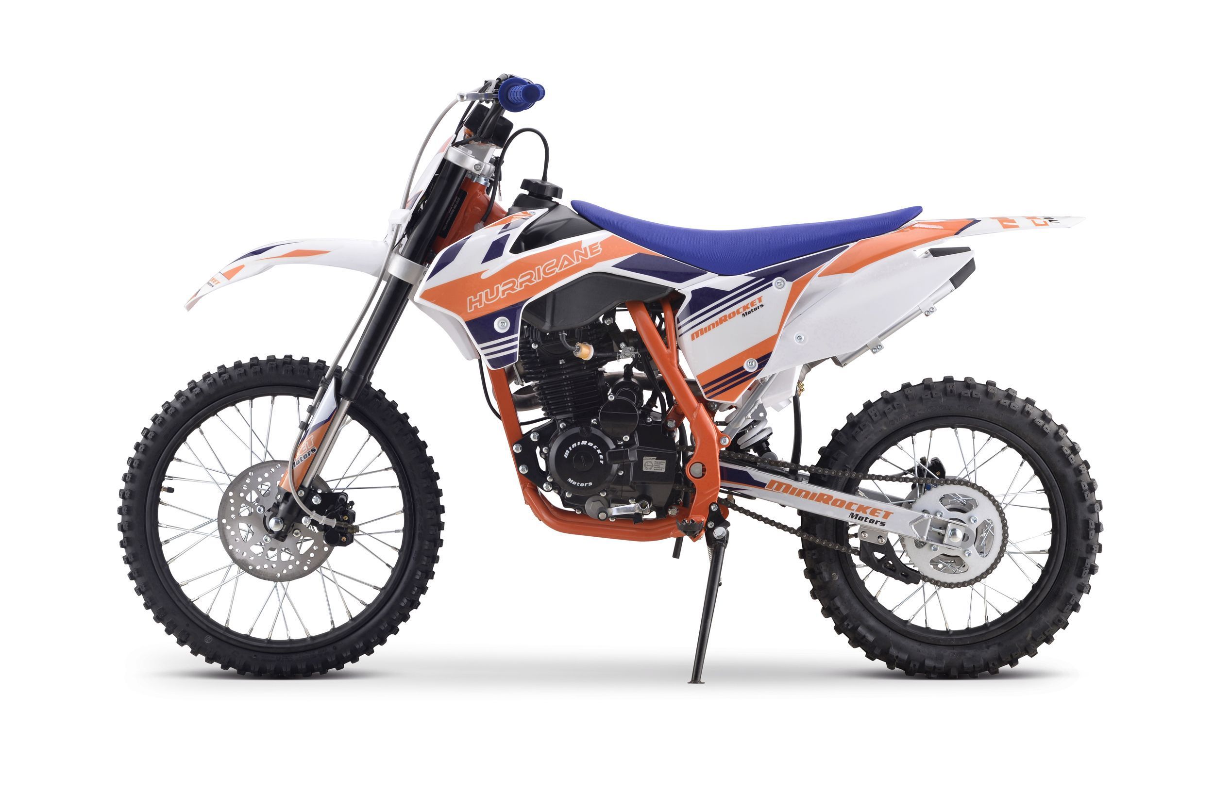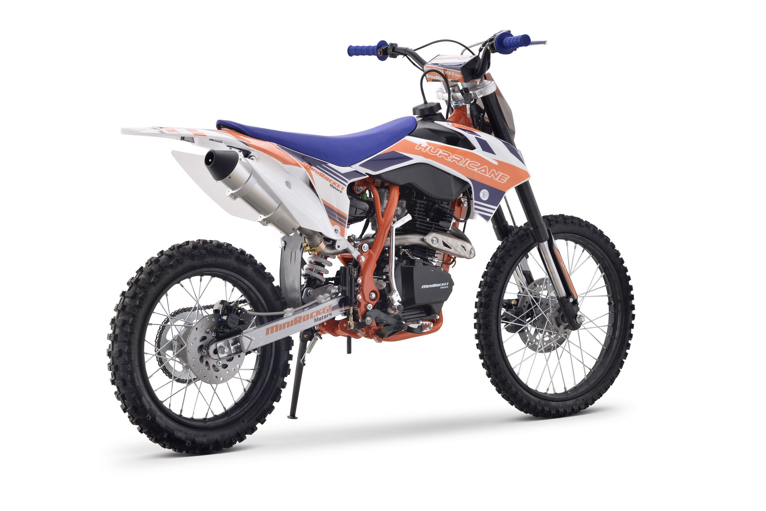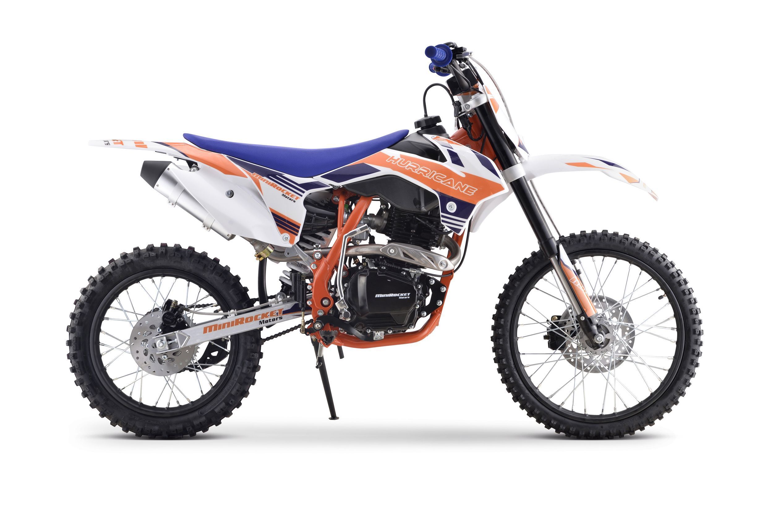 Pitbike Vollcross MiniRocket Hurricane 150ccm 5-Gang 19 16 Zoll Offroad Dieses Pitbike bietet eine hohe Leistung von 9,6 kW, ein manuelles 5-Gang-Getriebe, einen abgestimmten Auspuff mit beeindruckendem Klang, vorne und hinten hydraulische Scheibenbremsen, hochwertige Vordergabeln, einstellbare Härt