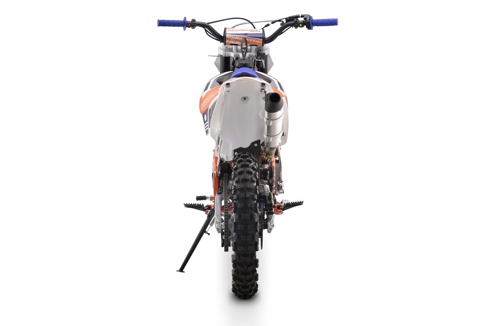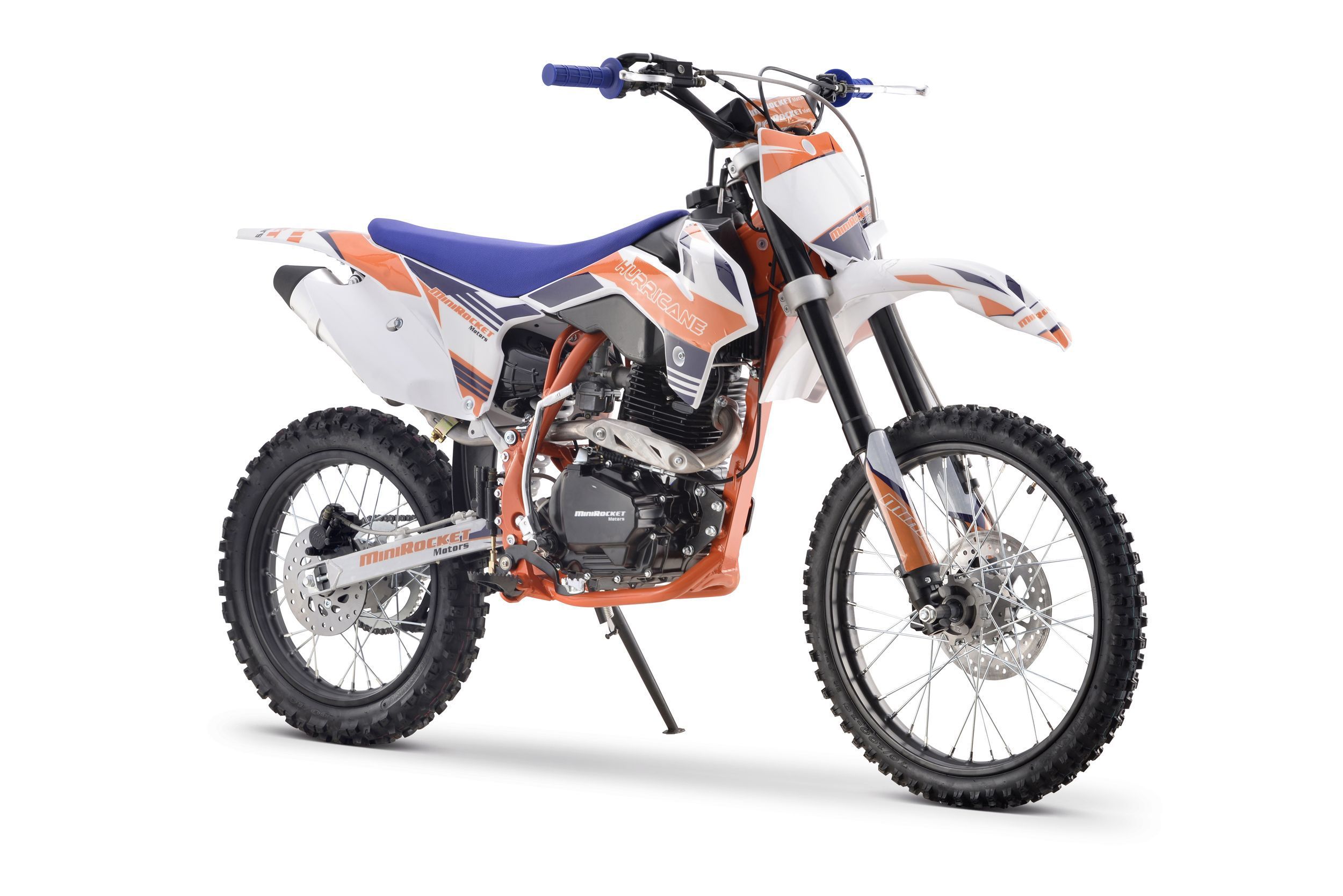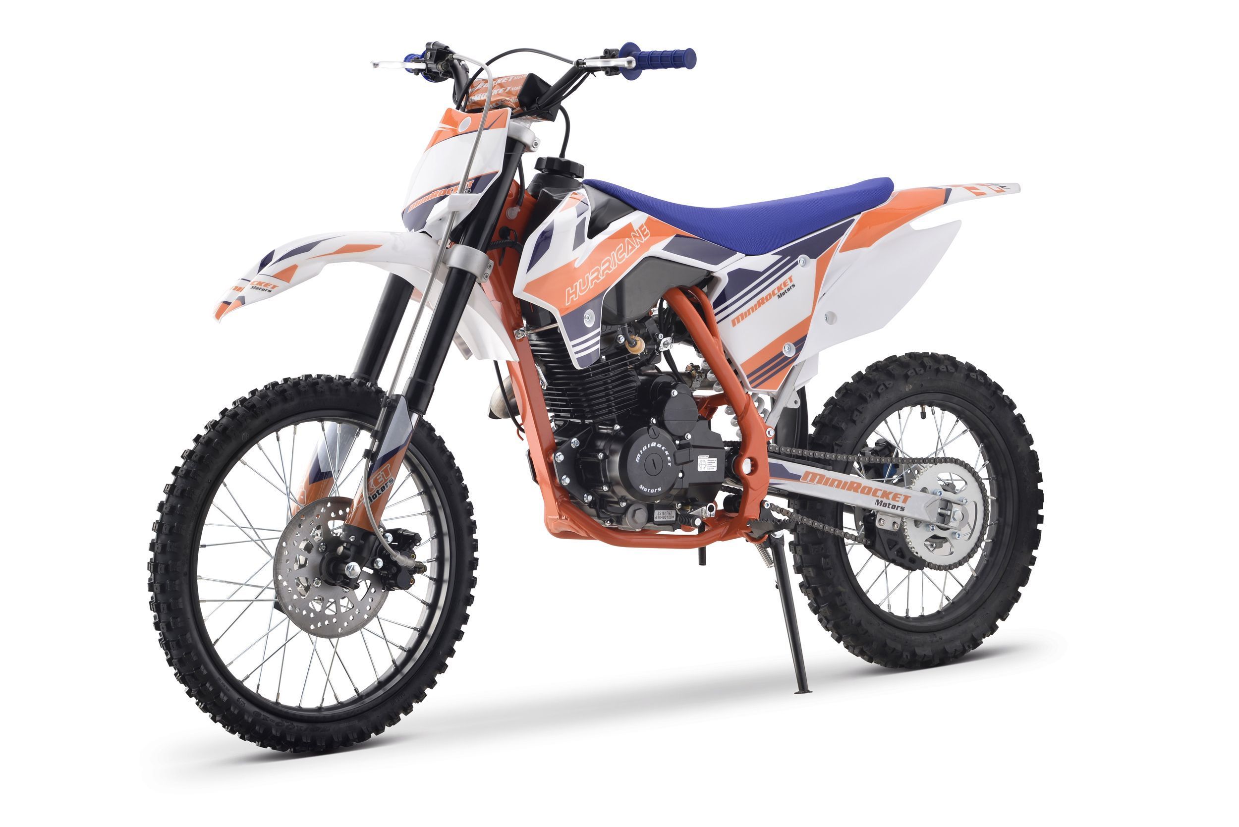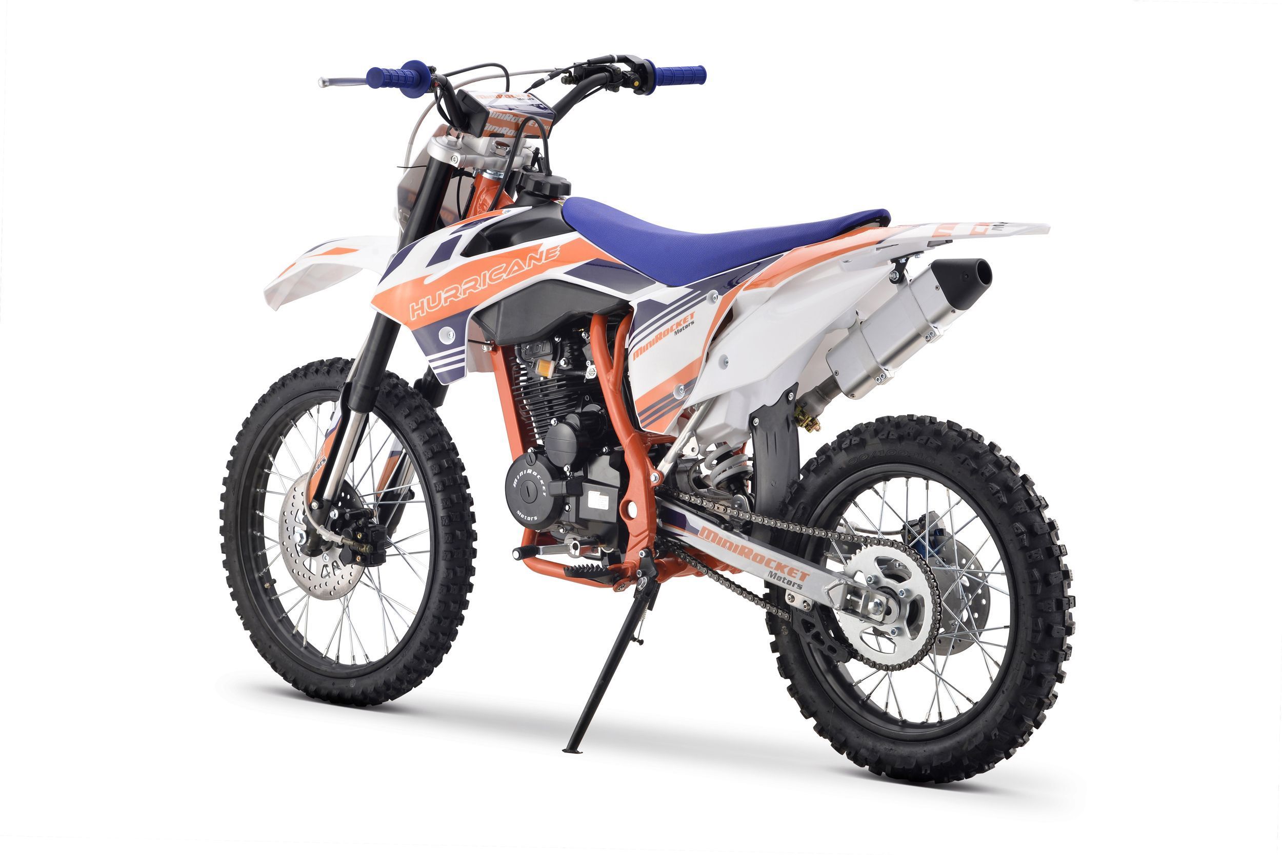 Pitbike Vollcross MiniRocket Hurricane 150ccm 5-Gang 19 16 Zoll Offroad Dieses Pitbike bietet eine hohe Leistung von 9,6 kW, ein manuelles 5-Gang-Getriebe, einen abgestimmten Auspuff mit beeindruckendem Klang, vorne und hinten hydraulische Scheibenbremsen, hochwertige Vordergabeln, einstellbare Härt