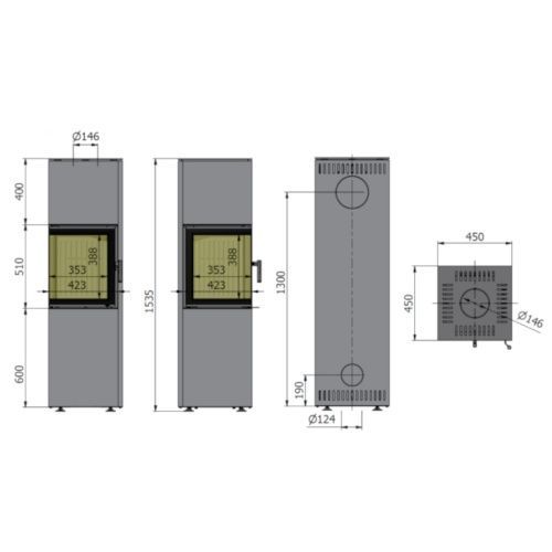 Die PIXEL Kaminöfen werden in drei Höhen angeboten: Pixel L - 133 cm, Pixel XL - 153 cm, Pixel XXL - 163 cm. Die Modelle unterscheiden sich in der Höhe des Sockels (40 oder 60 cm) und der Höhe der Deckplatte (40 oder 50 cm).