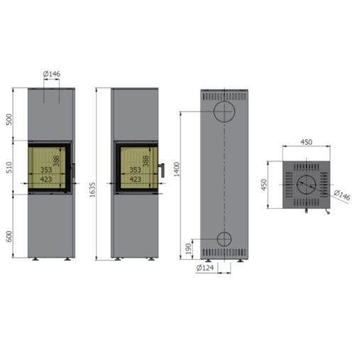 Die PIXEL Kaminöfen werden in drei Höhen angeboten: Pixel L - 133 cm, Pixel XL - 153 cm, Pixel XXL - 163 cm. Die Modelle unterscheiden sich in der Höhe des Sockels (40 oder 60 cm) und der Höhe der Deckplatte (40 oder 50 cm).