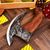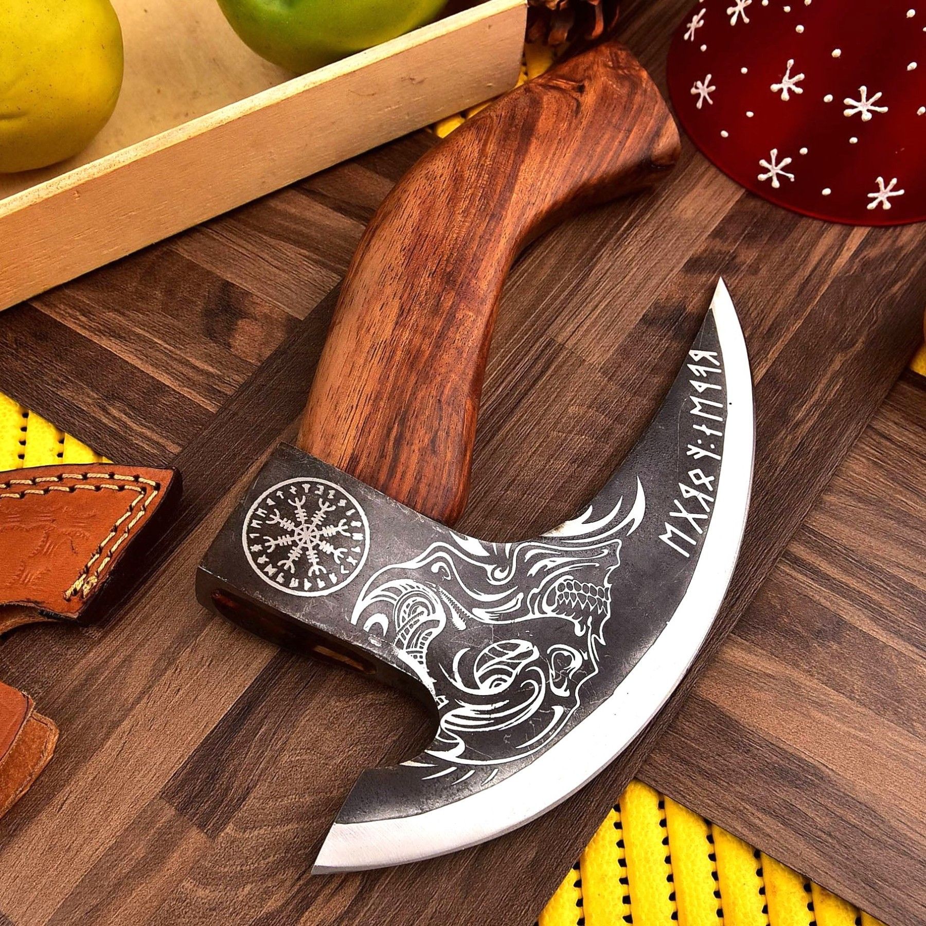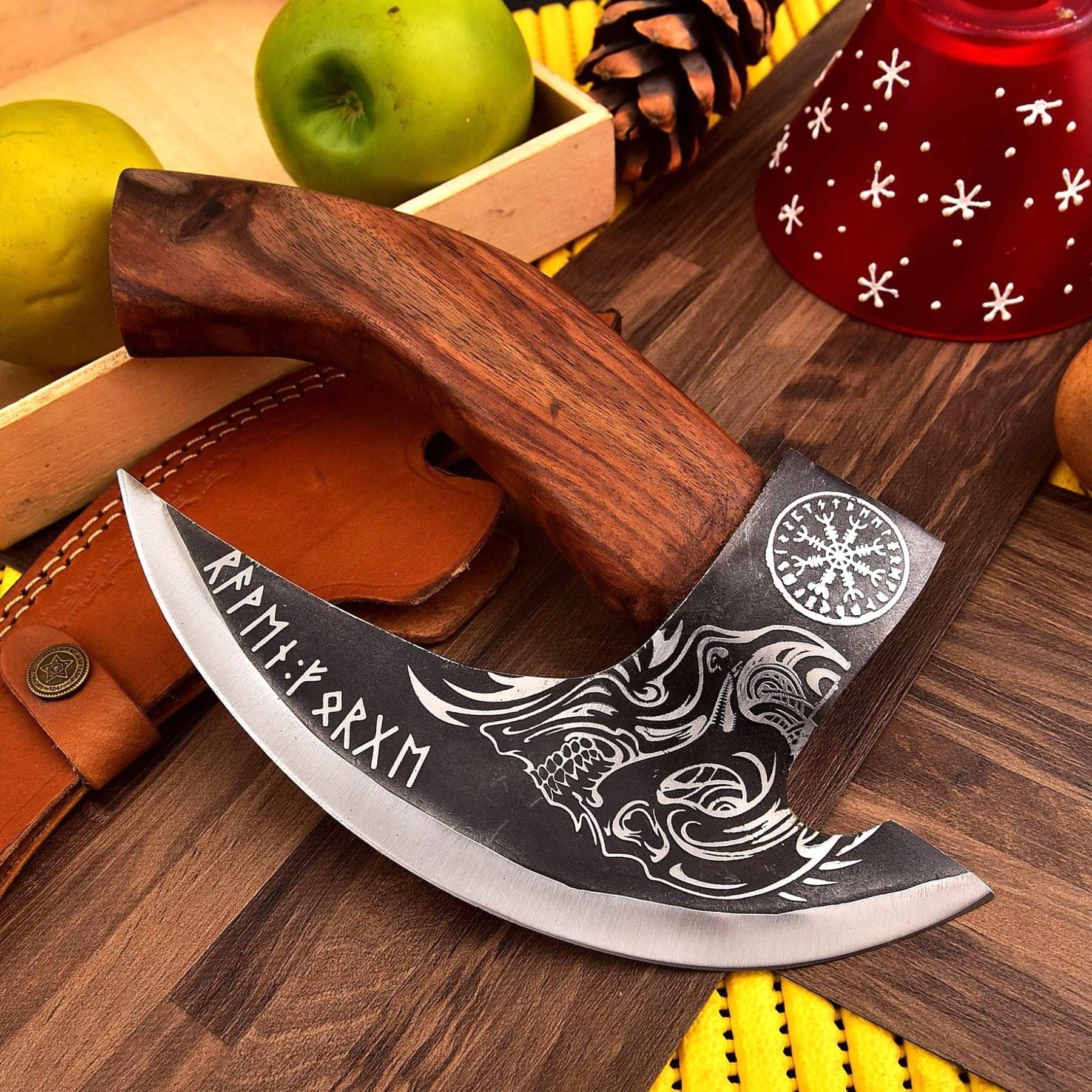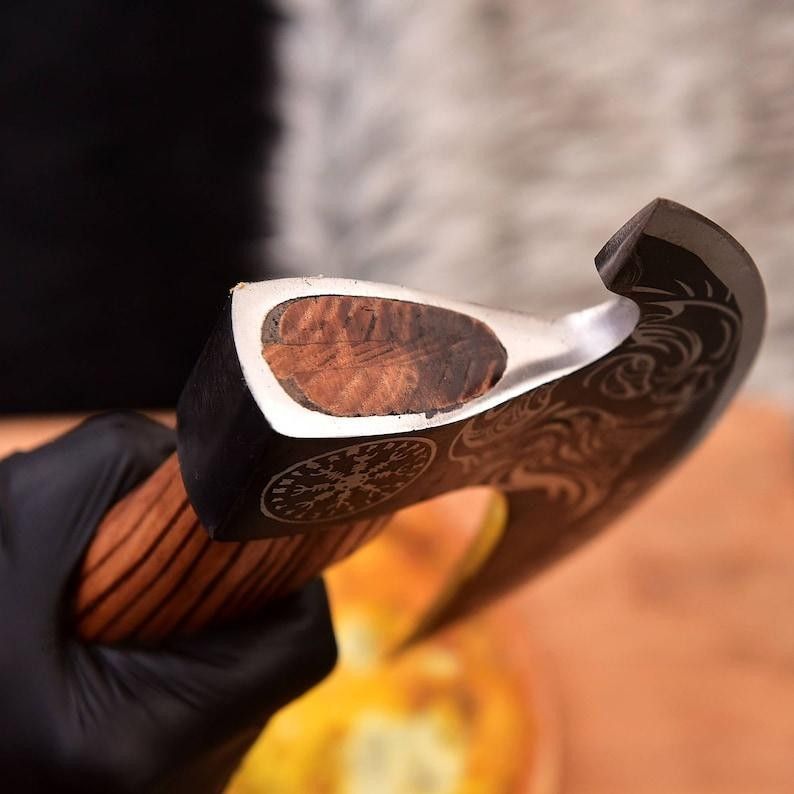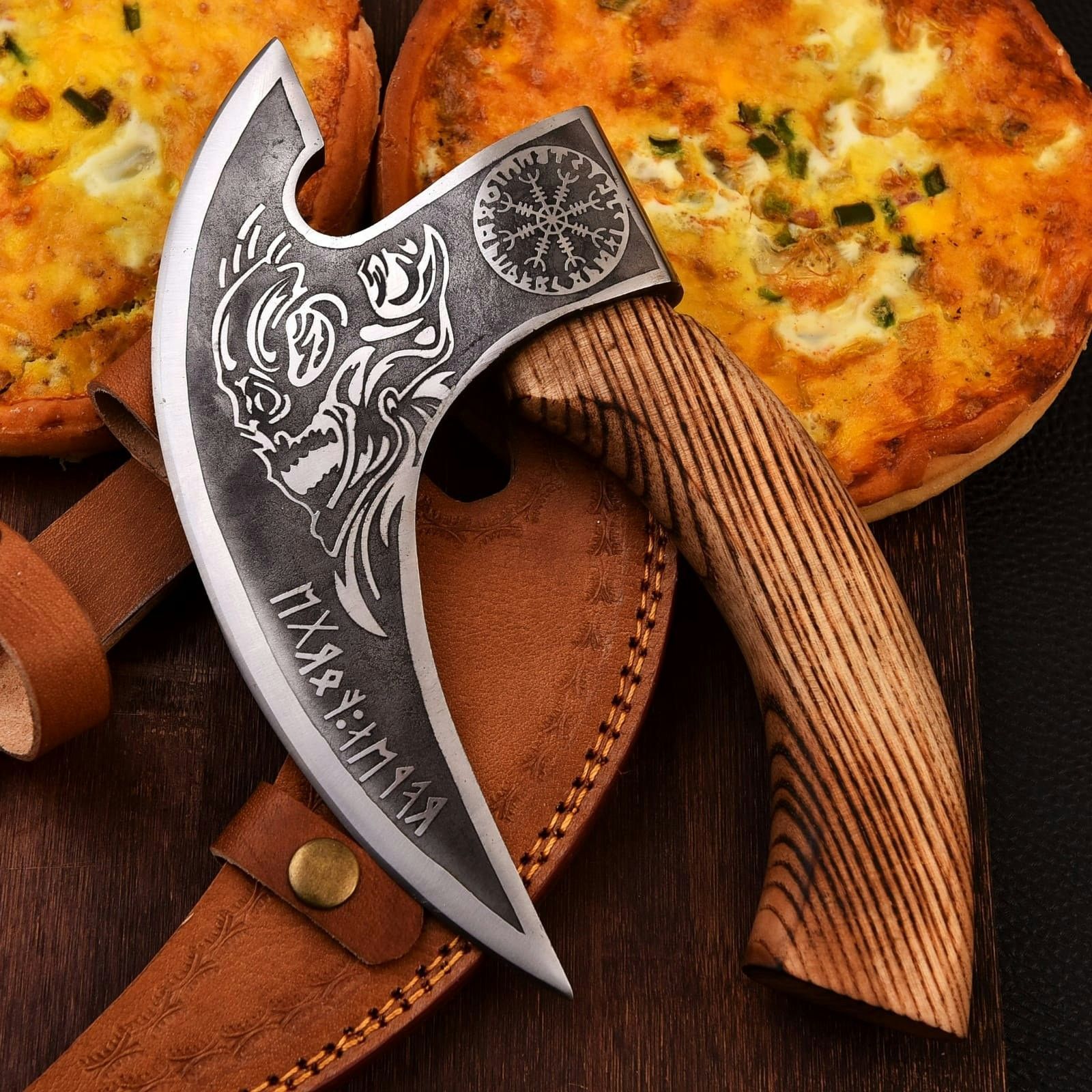 Hand-Forged Viking Pizza Axe A unique Viking-style pizza cutter axe made from forged carbon steel with a wooden handle and leather sheath included. Perfect for: Gifts, groomsmen, Father’s Day, birthdays, and Viking lovers. Handle with care.