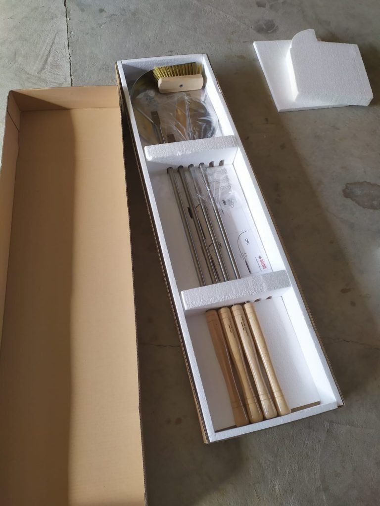 Pizzaschaufel Set 85 cm Länge, Holzgriff, vierteilig: 2 Schaufeln, Besen, Krücke
