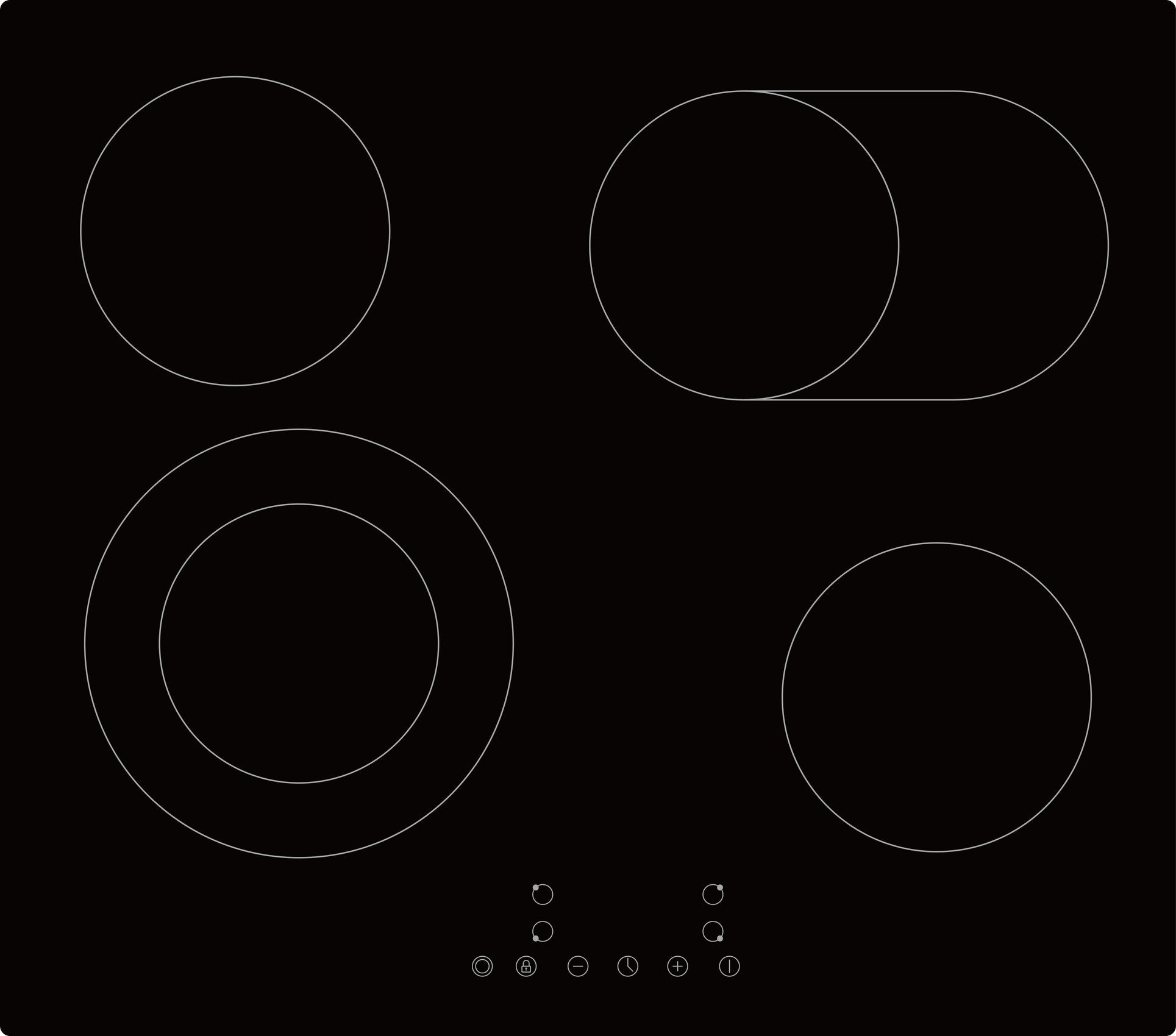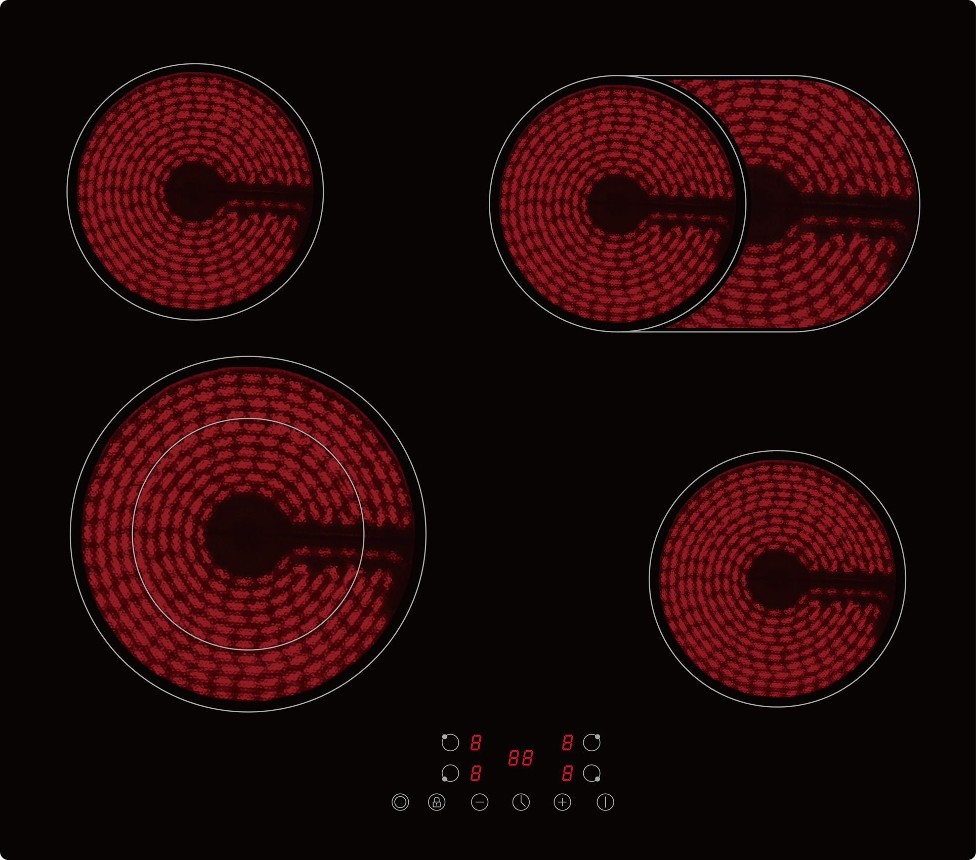 Bräterzone / Zweikreiszone / Glaskeramik / Rahmenlos / Timer / Kindersicherung / Restwärmeanzeige / Inklusive Kabel / Touch-Control / Abschaltautomatik / 9 Heizstufen pro Zone
