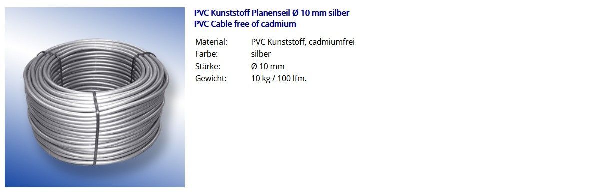 Kunststoff Planenseil Ø 10 mm silber PVC Kunststoff Planenseil Ø 10 mm silber PVC Cable free of cadmium Material: PVC Kunststoff, cadmiumfrei Farbe: silber Stärke: Ø 10 mm Gewicht: 10 kg 100 lfm. Seilendverschluss 10 mm mit Simplexhaken Cable End Closure with Simplex Snap-Hook A
