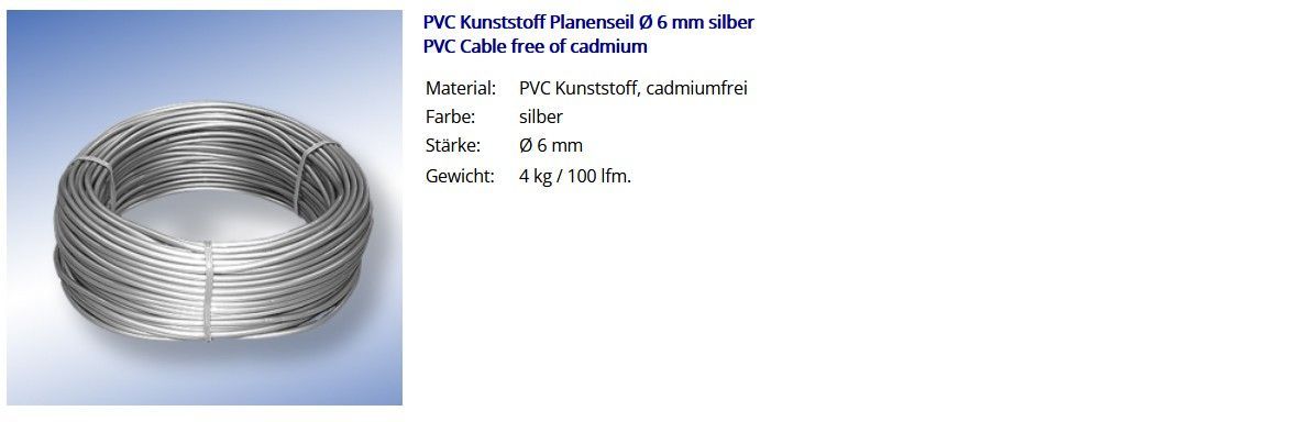 Kunststoff Planenseil Ø 6 mm silber PVC Kunststoff Planenseil Ø 6 mm silber PVC Cable free of cadmium Material: PVC Kunststoff, cadmiumfrei Farbe: silber Stärke: Ø 6 mm Gewicht: 4 kg 100 lfm. Seilendverschluss 6 mm mit Simplexhaken Cable End Closure with Simplex Snap-Hook Artike