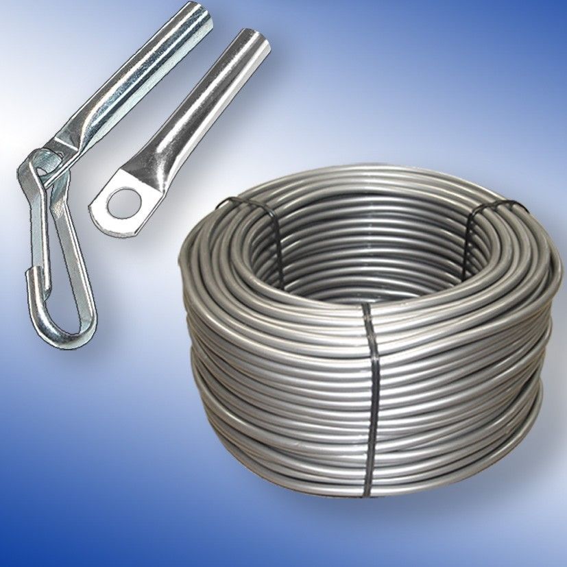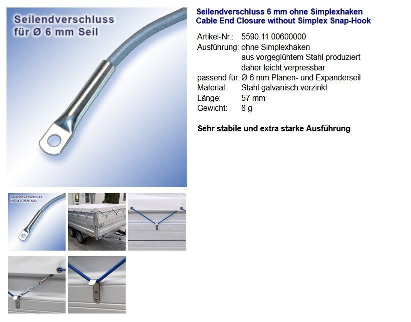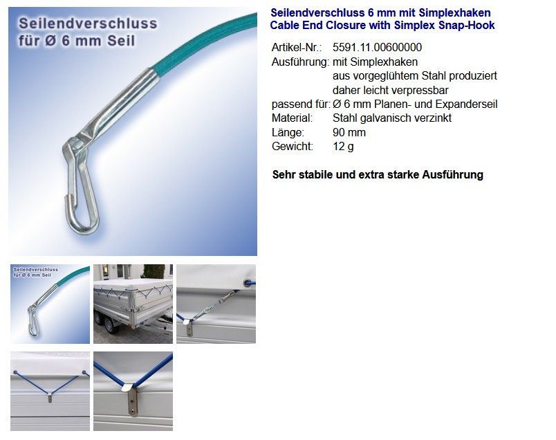 PVC Planenseil Ø 6 mm silber, Seilendverschluß ohne Simplexhaken und Seilendverschluß mit Simplexhaken