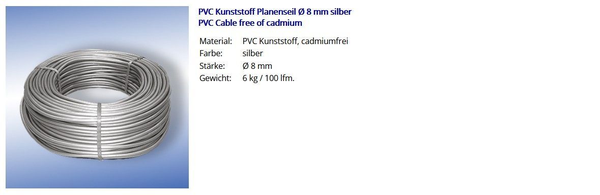 Kunststoff Planenseil Ø 8 mm silber PVC Kunststoff Planenseil Ø 8 mm silber PVC Cable free of cadmium Material: PVC Kunststoff, cadmiumfrei Farbe: silber Stärke: Ø 8 mm Gewicht: 6 kg 100 lfm. Seilendverschluss 8 mm ohne Simplexhaken Cable End Closure without Simplex Snap-Hook Ar