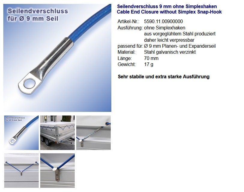 PVC Planenseil Ø 9 mm silber, Seilendverschluß ohne Simplexhaken und Seilendverschluß mit Simplexhaken