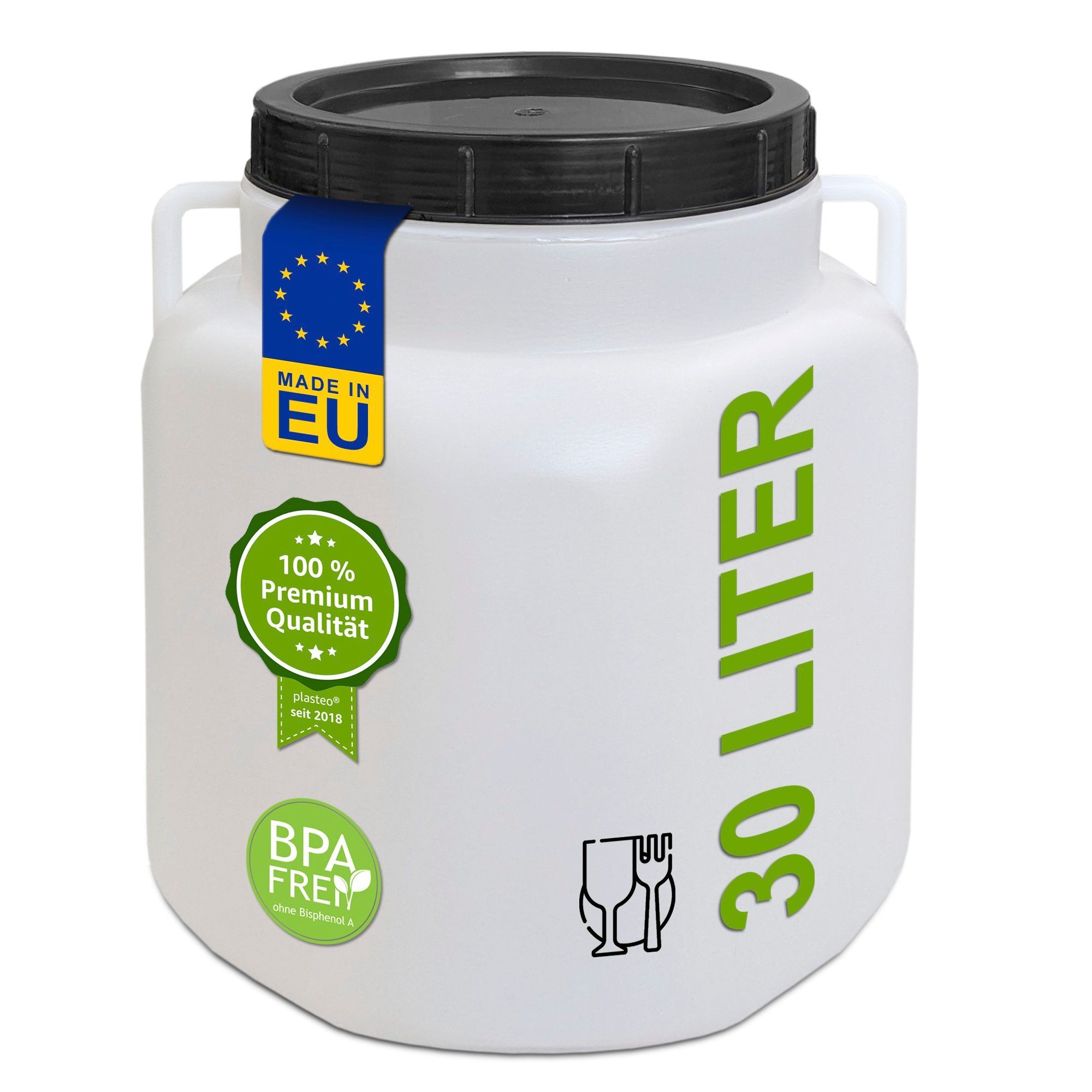 plasteo® 30 Liter Weithalsfass Natur Eckig mit Deckel und Henkeln, Lebensmittelecht