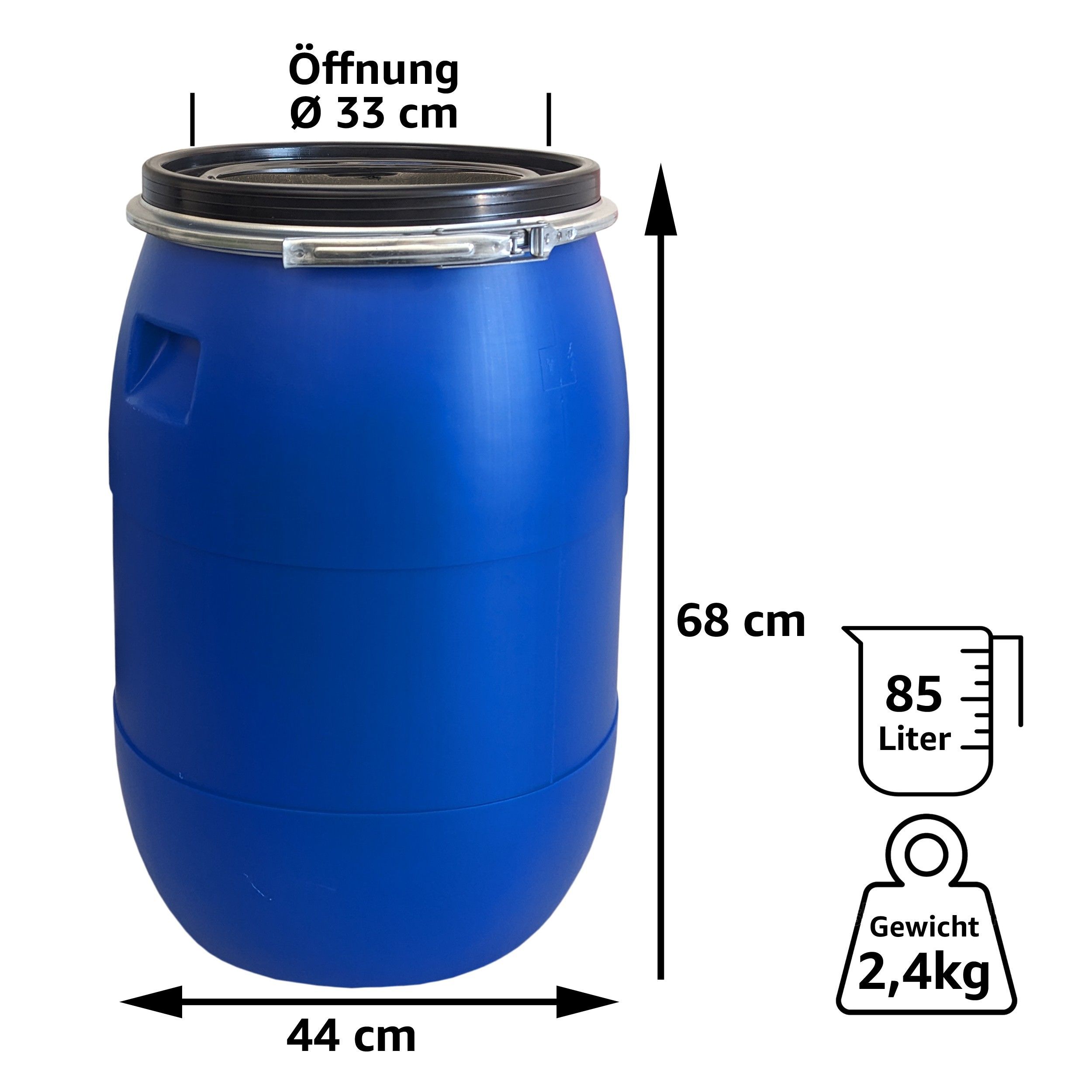 plasteo® 85 Liter Weithalsfass mit Deckel und Spannring, Lebensmittelecht BPA-Frei