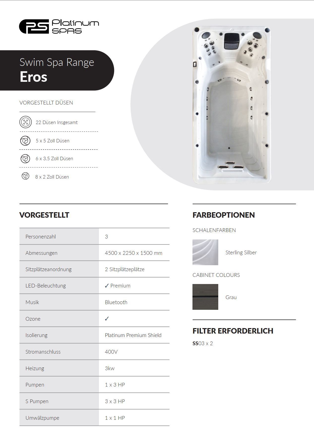 Platinum Spas Eros Pro Swim Spa 450x225x150cm Turbine inkl. Cover Swimspa