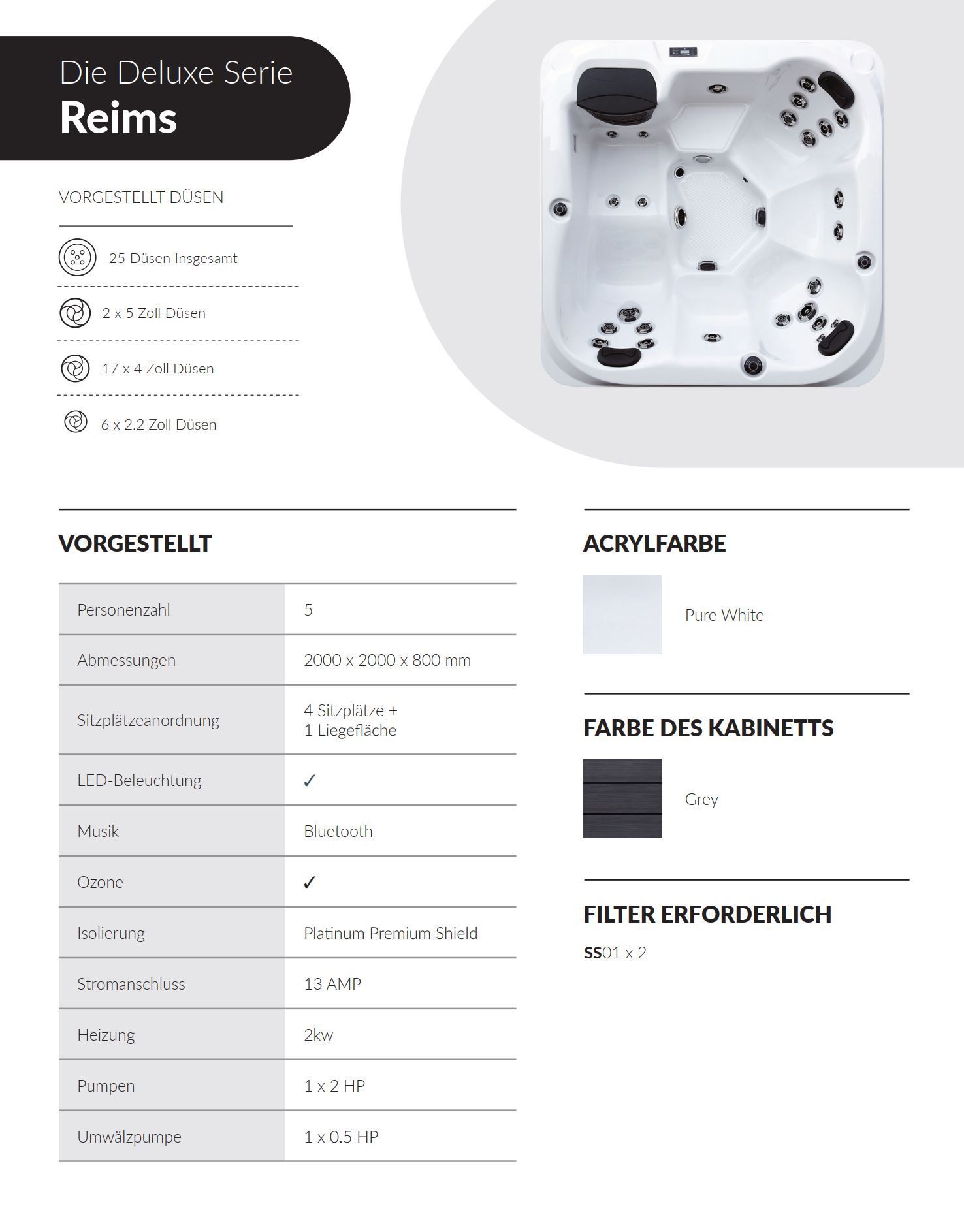 Entdecken Sie den Reims Whirlpool der Deluxe-Serie von Superior Wellness Platinum Spas. Platz für 5 Personen, 25 Düsen, LED-Beleuchtung, Bluetooth, Ozon-Desinfektion und Premium-Isolierung. Erhältlich ab 01.01.2025. Jetzt vorbestellen!