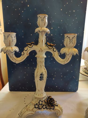 Sie erhalten einen prächtigen Leuchter Kerzenleuchter Kerzenständer in Kobalt blau Goldrand aus der Porzellanmanufaktur von Schierholz Plaue in Thüringen. Der Kerzenleuchter wurde handbemalt und vom Künstler signiert. Der Kerzenständer hat vier Flammen. Der Leuchter ist in einem guten Zustand. Leich