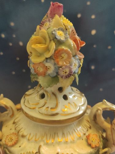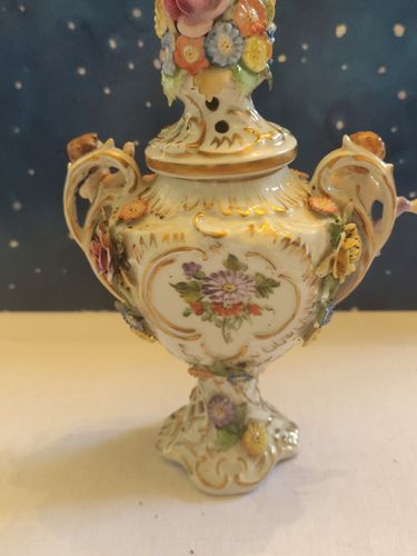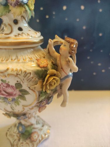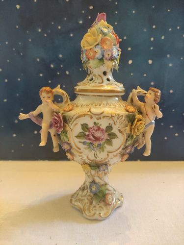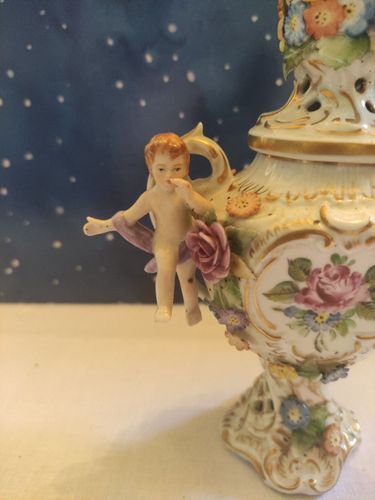 Plaue Porzellan Schierholz Thüringen Vase Prunkvase auf Fuss Blumen Puttengriff