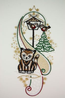 • Fensterbild Weihnachten Spitze Fensterdekoration Plauener Stickerei Katze Winter