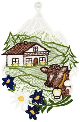 • Fensterbild Landhaus Spitze Fensterdekoration Plauener Stickerei Kuh Alpen