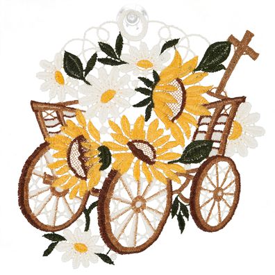 • Fensterbild Plauener Spitze Stickerei Fensterdekoration Handwagen Sonnenblumen