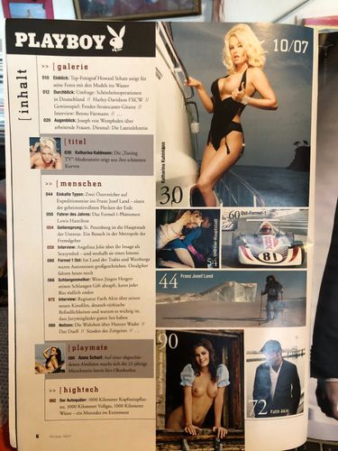 Erscheinungsmonat: Oktober Herstellungsland: Deutschland Verlag: Playboy Deutschland Genre: Frauen, Männer Sprache: Deutsch Ausgabe: Monatlich Ausgabejahr: 2007 Zeitschriftentitel: Playboy DIN A 4 Pappcover, 186 Seiten, Neupreis 4,60 €, Inkl. Bunny-Streichhölzer.