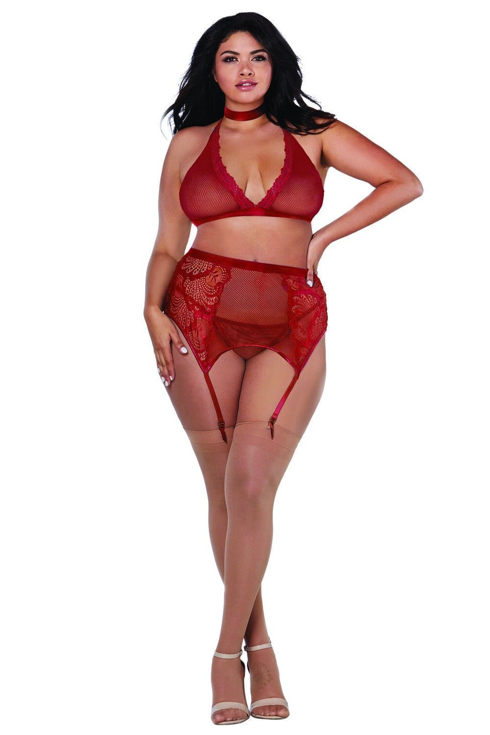 Plus Size 4-tlg. Netz Dessous Set Rot BH, String, Strapsgürtel, Choker QueenSize