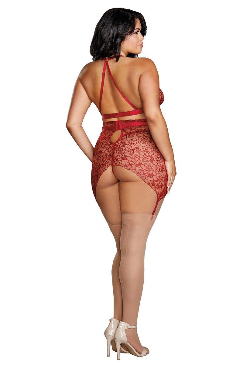 Plus Size BH Set Rot mit Strapsgürtel aus Spitze und Satin Gr. XL, 2XL, 3XL