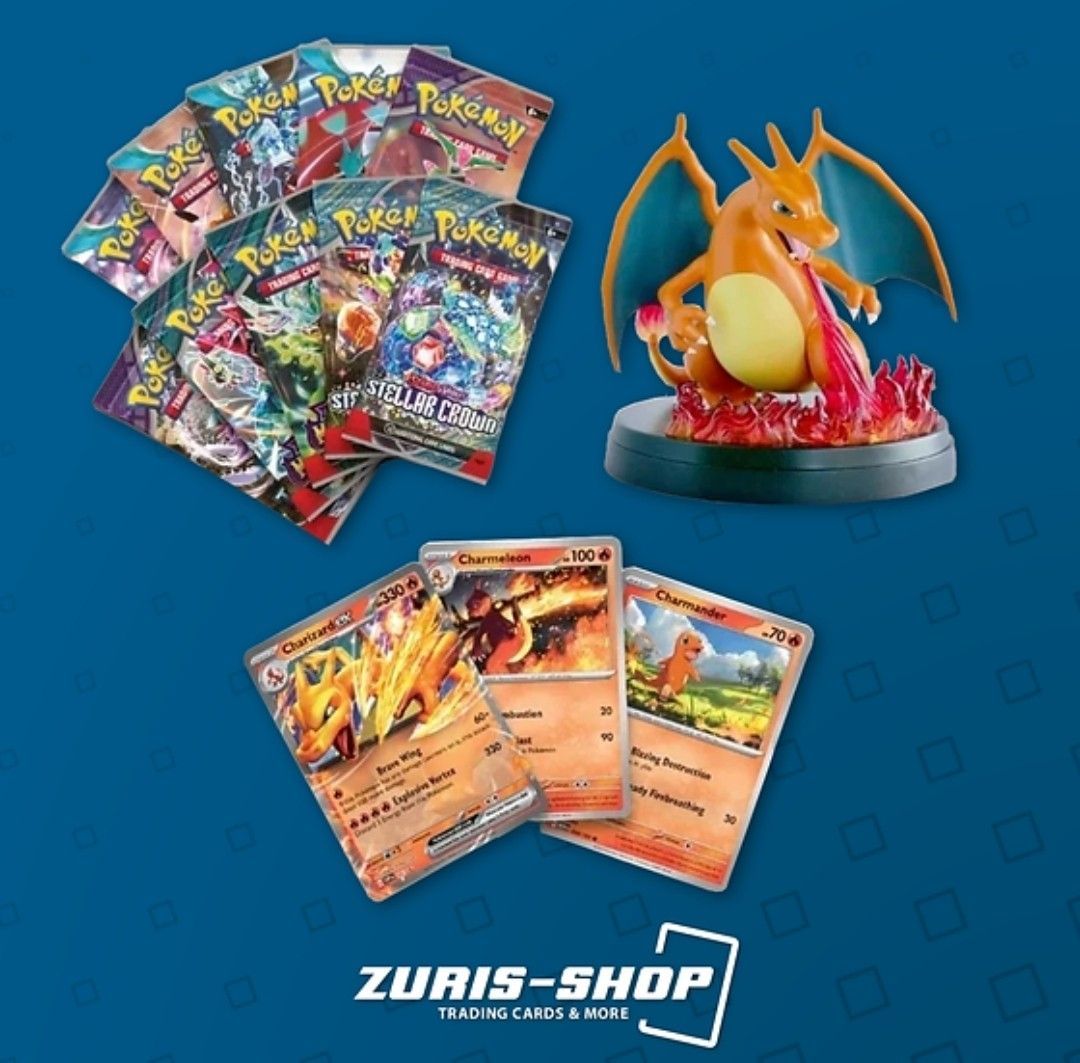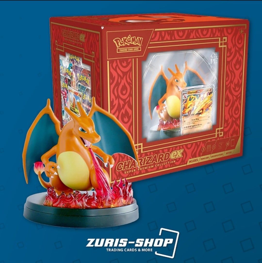 Vorbestellung - Release 04.10.2024 Charizard ex Super-Premium Collection Achtung! Nicht geeignet für Kinder unter drei Jahren aufgrund von Erstickungsgefahr durch verschluckbare Kleinteile.