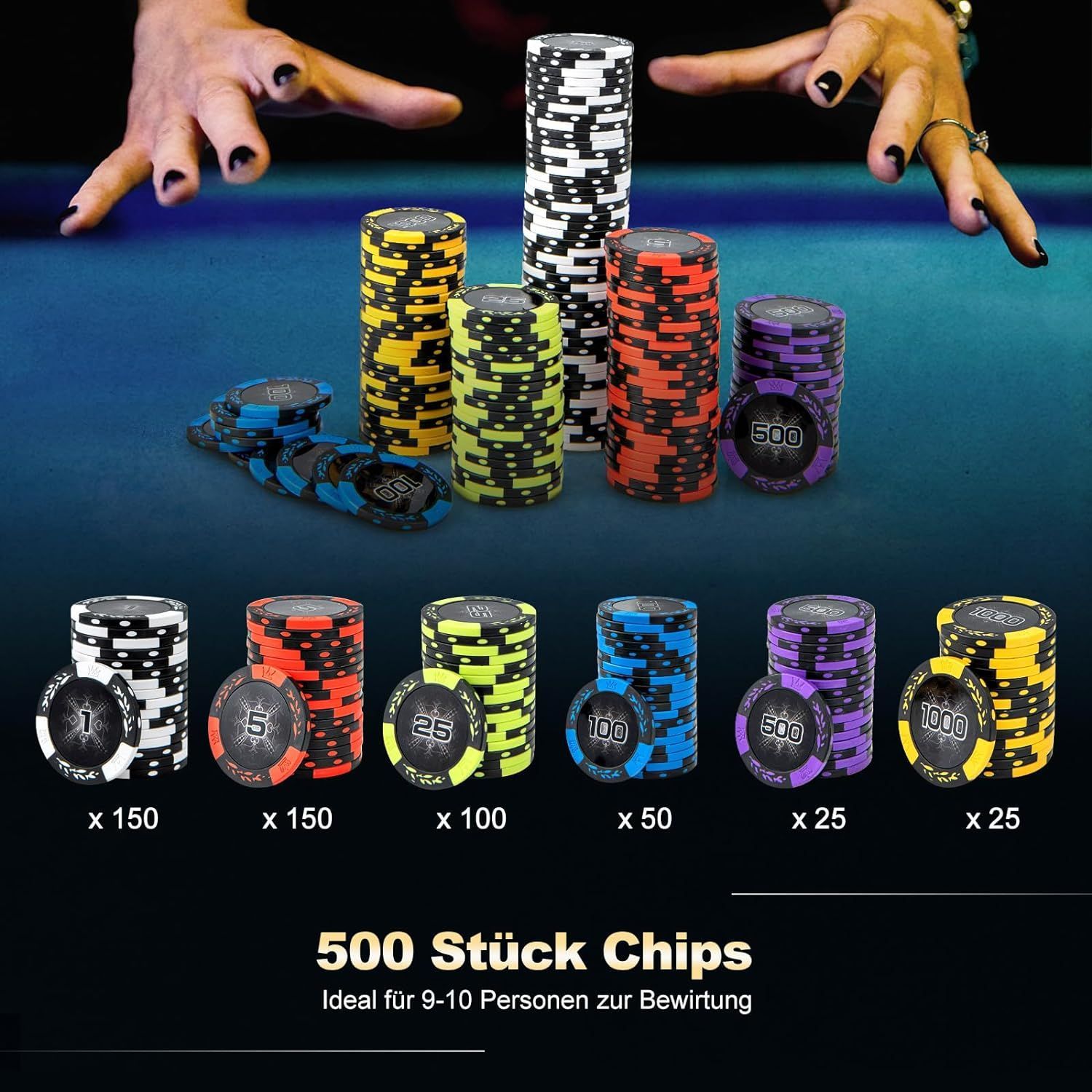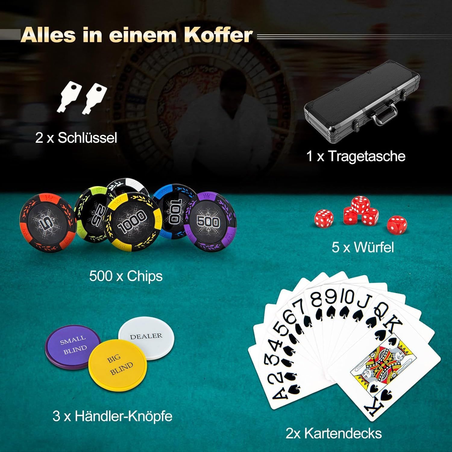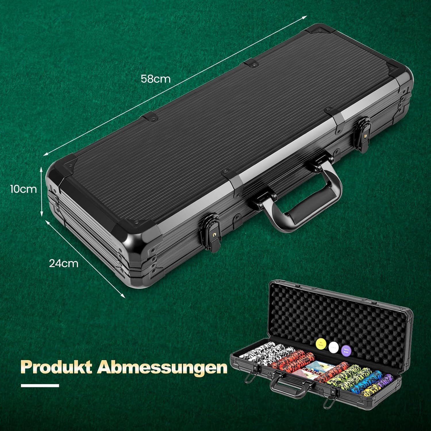 Pokerset mit 500 Laser-Chips, Pokerkoffer mit 2 Spielkarten, 5 Würfeln, 2 Schlüsseln