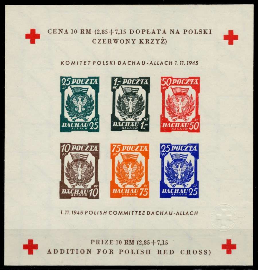 POLEN DACHAU KRIEGSGEFANGENENLAGERPOST BLOCK 2 Dachau Kriegsgefangenenlagerpost Blockausgabe II, geschnitten, Papier weiss, Wasserzeichen quadratische Säulen von links unten nach rechts oben steigend (For Polish red Cross Komitet Polski Polish Committee Dachau - Allach 1.11.1945) 20.53€ incl. M