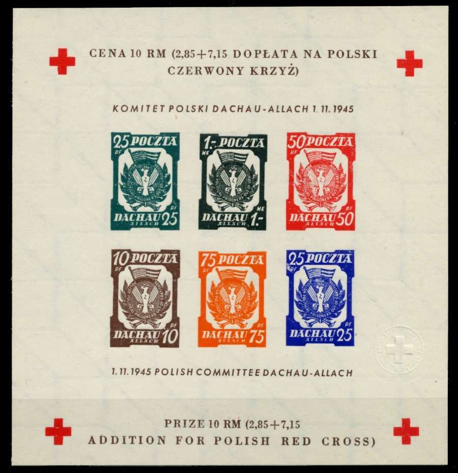 POLEN DACHAU KRIEGSGEFANGENENLAGERPOST BLOCK 2 Dachau Kriegsgefangenenlagerpost Blockausgabe II, geschnitten, Papier weiss, Wasserzeichen quadratische Säulen von links unten nach rechts oben steigend (For Polish red Cross Komitet Polski Polish Committee Dachau - Allach 1.11.1945) 20.53€ incl. M