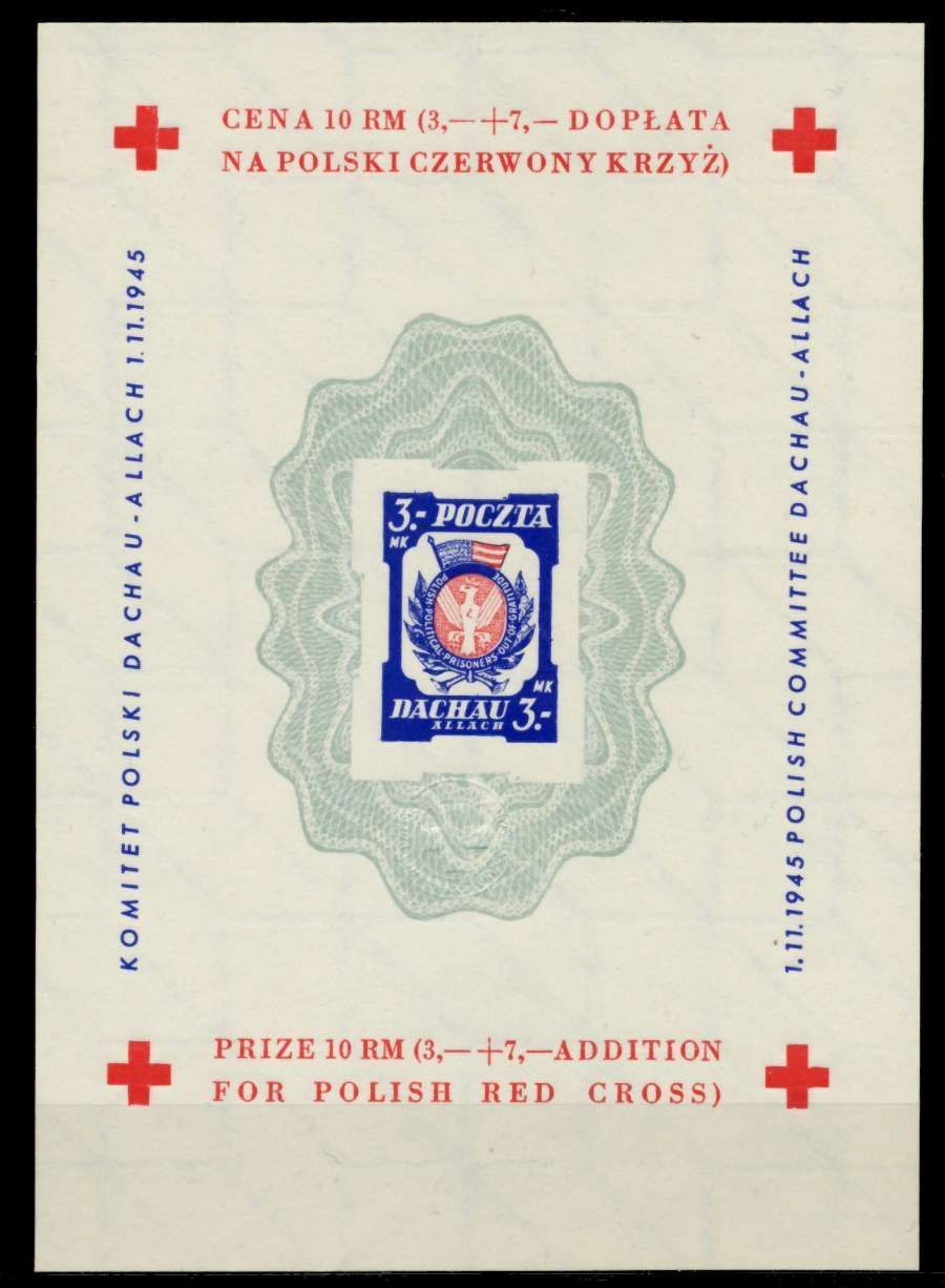 POLEN DACHAU KRIEGSGEFANGENENLAGERPOST BLOCK 3 Dachau Kriegsgefangenenlagerpost Blockausgabe III, geschnitten, Papier weiss, Wasserzeichen quadratische Säulen von links unten nach rechts oben steigend (For Polish red Cross Komitet Polski Polish Committee Dachau - Allach 1.11.1945) 20.53€ incl.