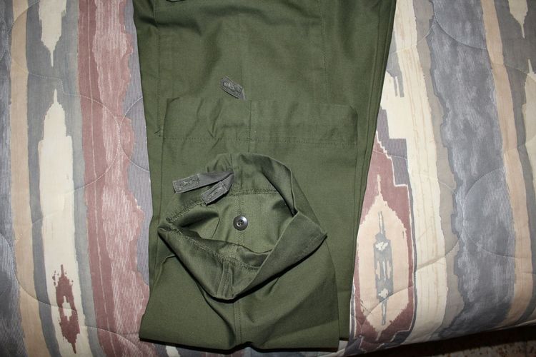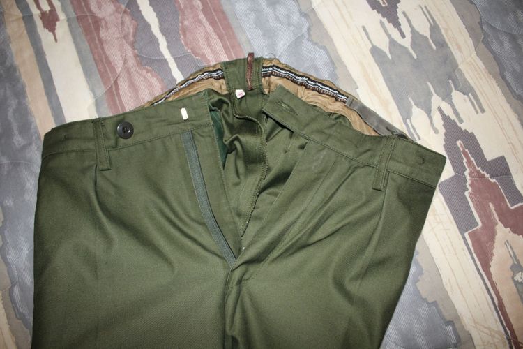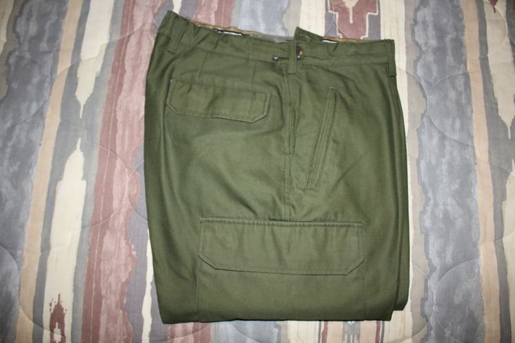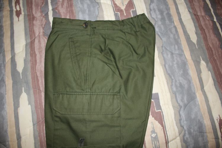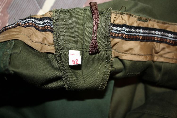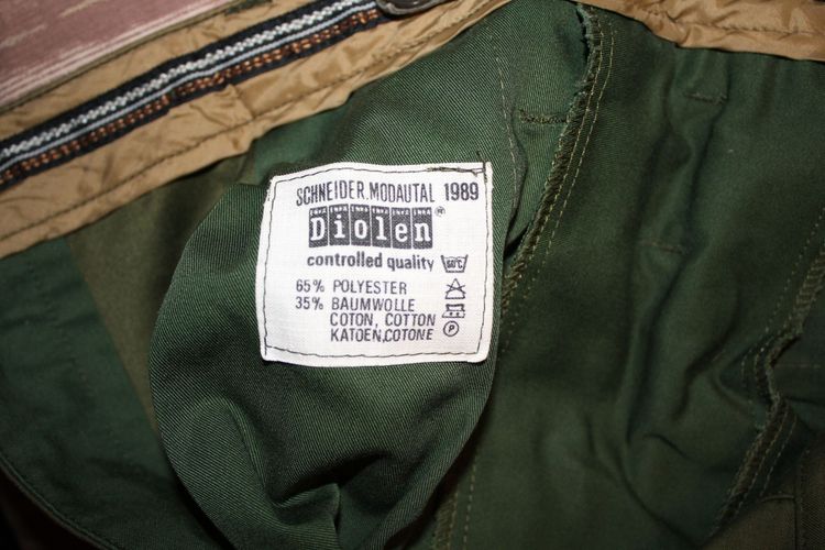 nur wenig getragene Einsatzhose, moosgrün, aus den 90er Jahren – lange vor der Umstellung auf blaue Uniformen, Größe 52, robustes Material aus 65 % Polyester und 35 % Baumwolle, desweitern auf einem Etikett: SCHNEIDER.MODAUTAL 1989 DIOLEN, 2 leicht schräg sitzende Eingriffstaschen, 2 große Seitentas