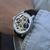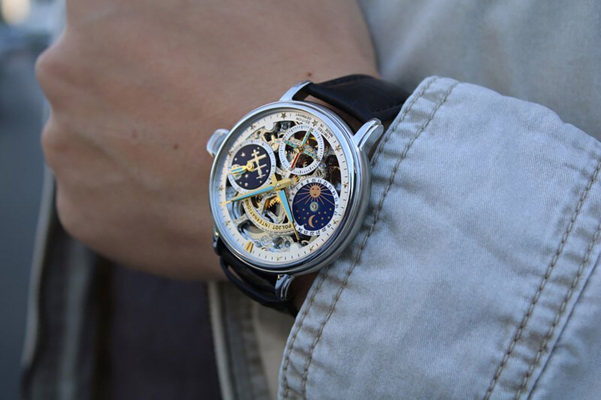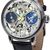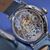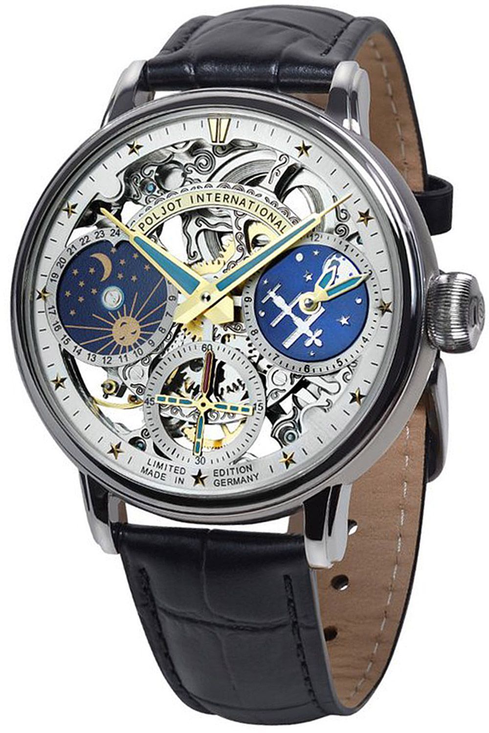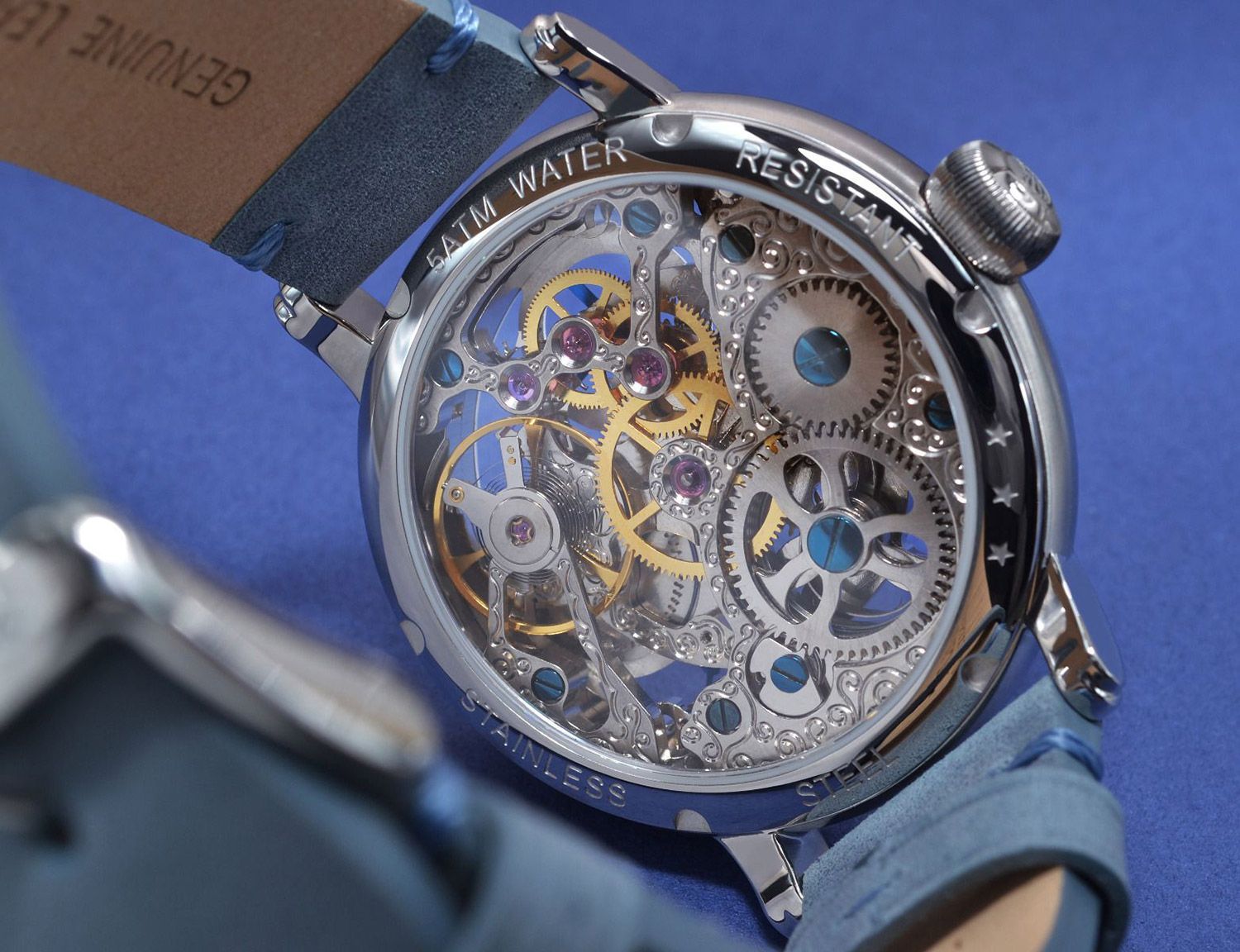 edle Herren-Armbanduhr mit mechanischem Uhrwerk, Made in Germany, limitiert auf 400 Stück, Mechanikwerk mit Handaufzug, fein verziert und teils gold plattiert, Anzeige einer zweiten Uhrzeit, Tag- und Nacht-Anzeige durch Sonne und Mond, kleine Sekunde, skelettiertes silberfarbenes Zifferblatt mit Sicht auf das Uhrwerk, dunkelblaue Hilfszifferblätter, türkisfarben akzentuierte Zeiger, goldfarbene sternförmige Stundenpunkte, Gehäuse aus mattiertem Edelstahl, polierte Lünette und Bandansätze, versch