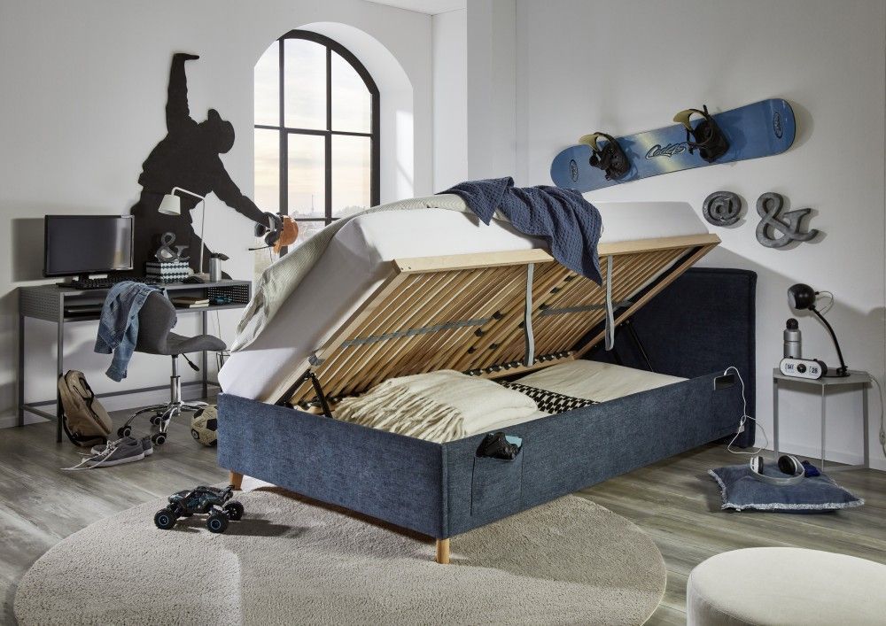 Meise Möbel Polsterbett mit Bettkasten Lattenrost 3 Größen Jugendbett USB-Anschluss Blau
