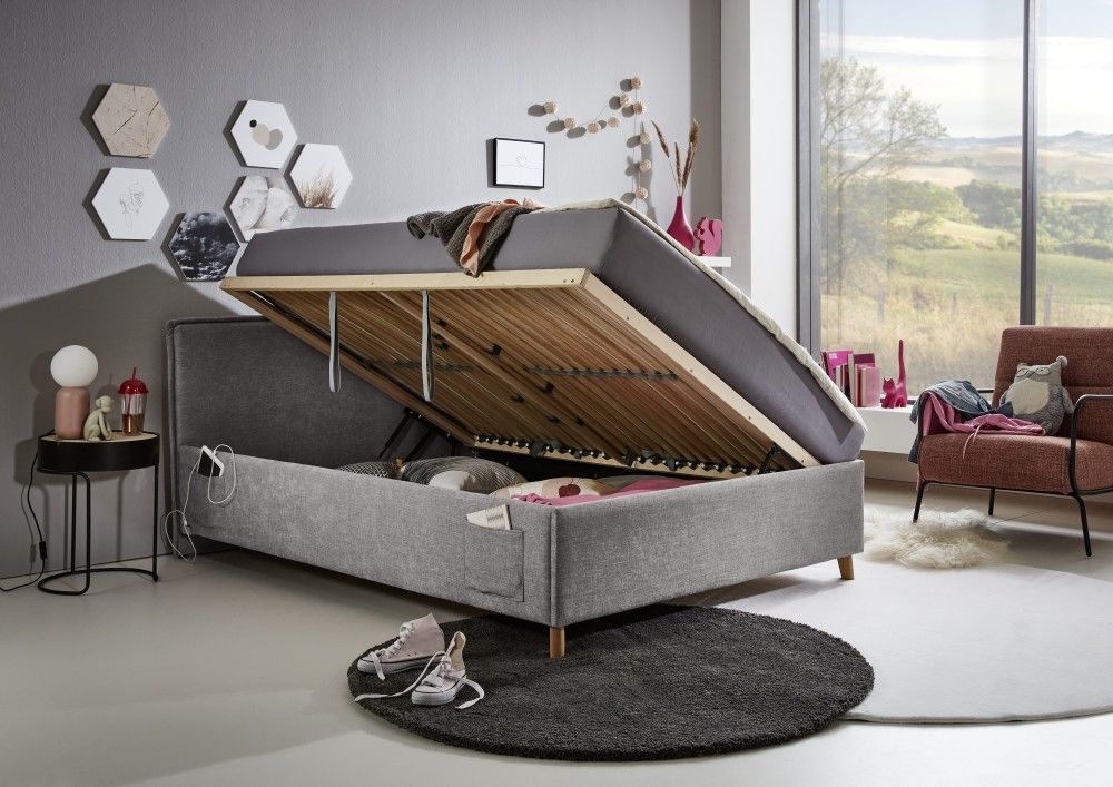 Meise Möbel Polsterbett mit Bettkasten Lattenrost 3 Größen Jugendbett USB-Anschluss Grau