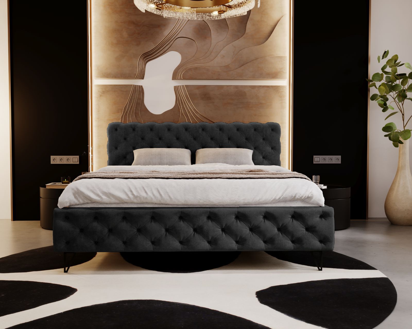 • Barock Polsterbett Unicorn Lederbett Leder Bett schwarz mit Strasssteine Lattenrost