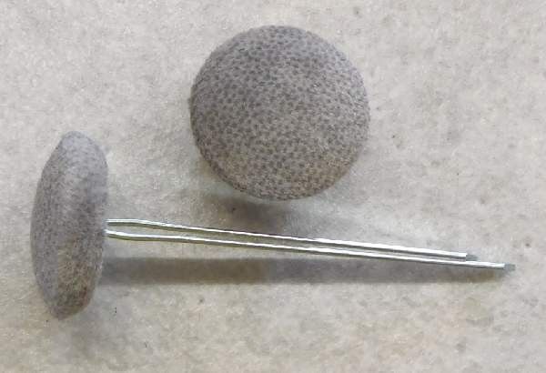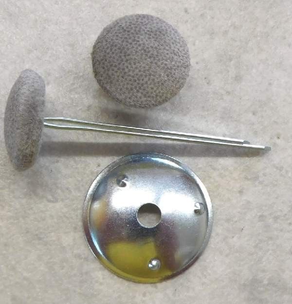 Polsterknöpfe mit Splint mit Mikrofaser bezogen Bezugsstoff: Mikrofaser Polsterstoff Farbe: Grau Knopfdurchmesser ca. 19mm Länge des Splintes: ca. 51mm Für die Montage mit festen Rücken (Spanplatte oder Ähnlichem) wird keine Gegenscheibe benötigt. Durch die digitale Darstellung und Verarbeitung kann es zu Farbunterschieden kommen.