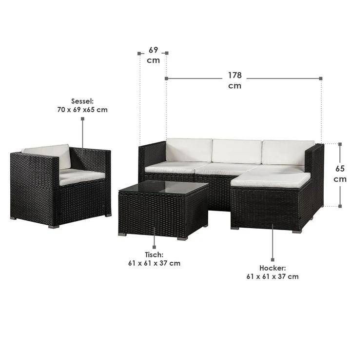 Polyrattan Lounge Punta Cana B-WARE Outdoor Sitzgarnitur für bis zu 4 Personen Artikelnummer: 200157 - Schwarz, Creme Größe L B-WARE mit 12 Monate Gewährleistung Bitte haben Sie Verständnis, dass wir keine Möglichkeit haben Original-Fotos einzelner Produkte zu erstellen. Technische Daten: Material G... Mehr
