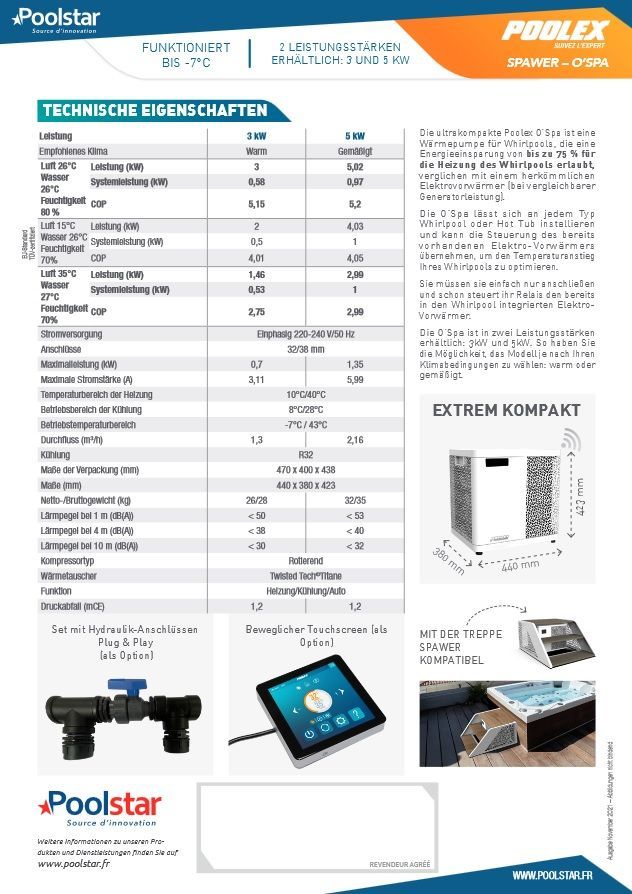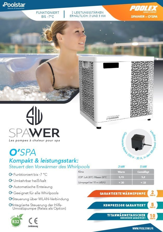 Poolex O’SPA Whirlpool Wärmepumpe 3–7 kW mit Heiz- und Chillerfunktion, WLAN-Steuerung, Titan-Wärmetauscher und bis zu 75 % Energieersparnis gegenüber Elektroheizern.