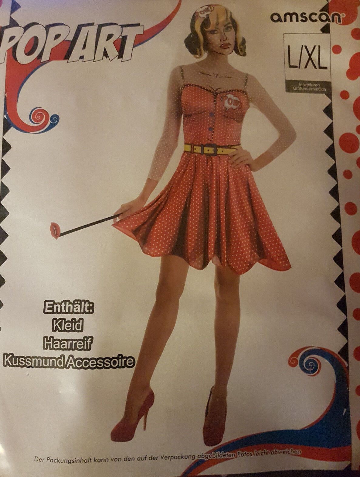 Pop Art Damenkostüm Kleid, Haareif & Kussmund S/ M & L/ XL Karnevalskostüm