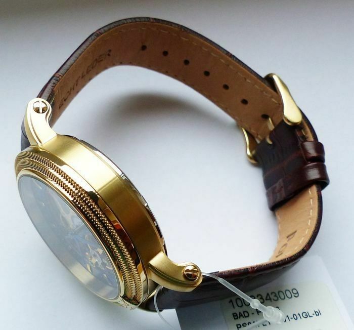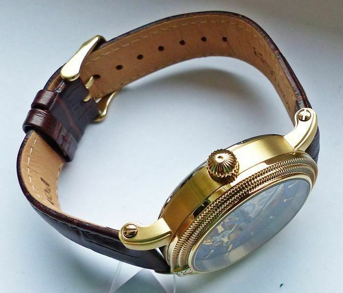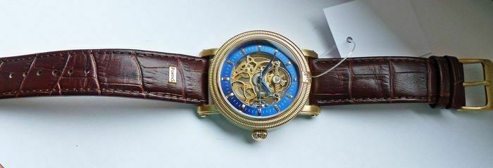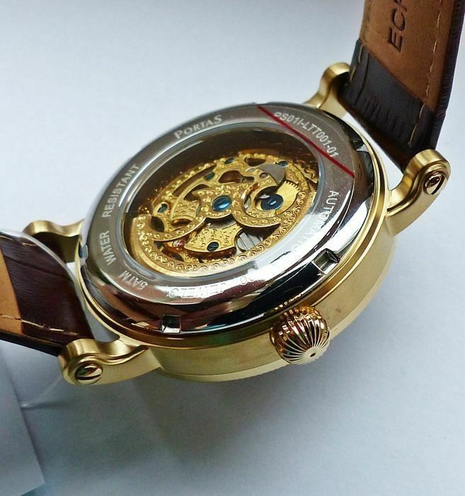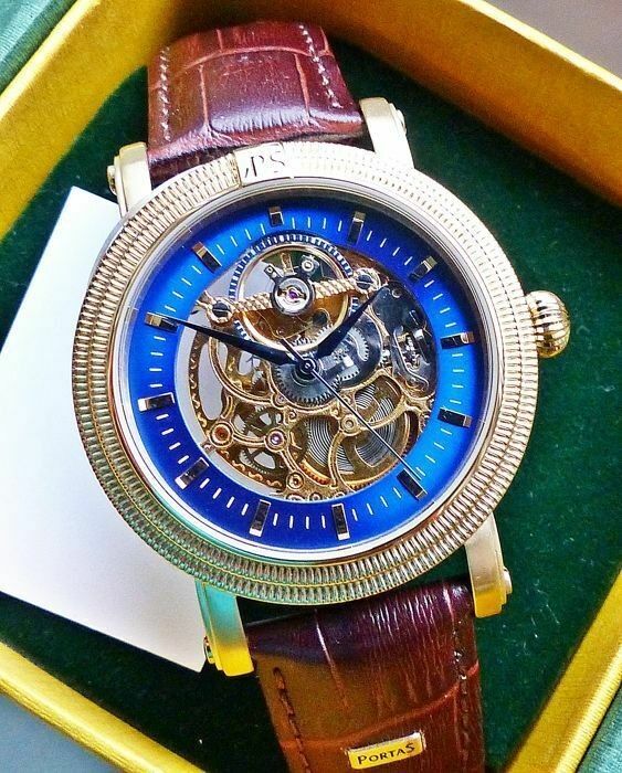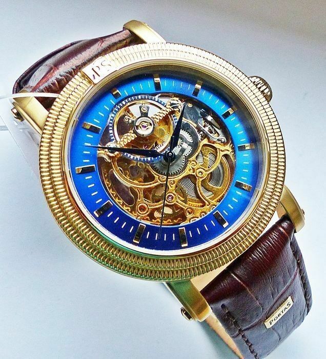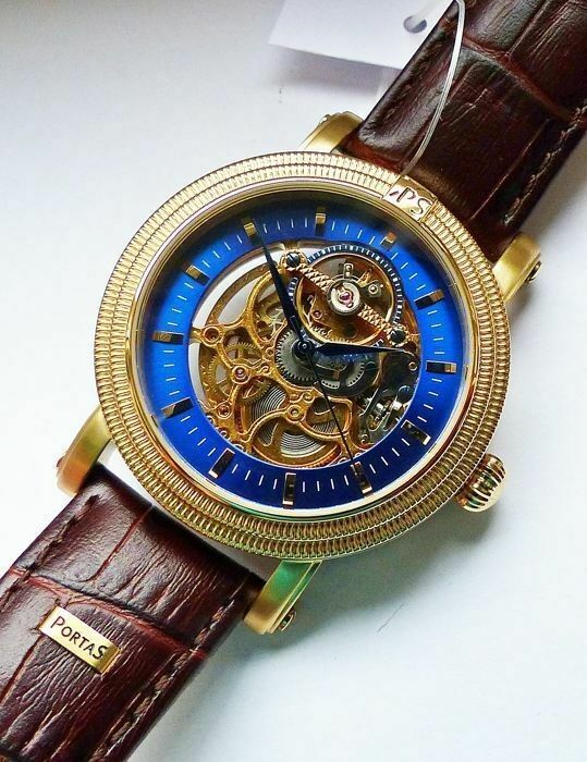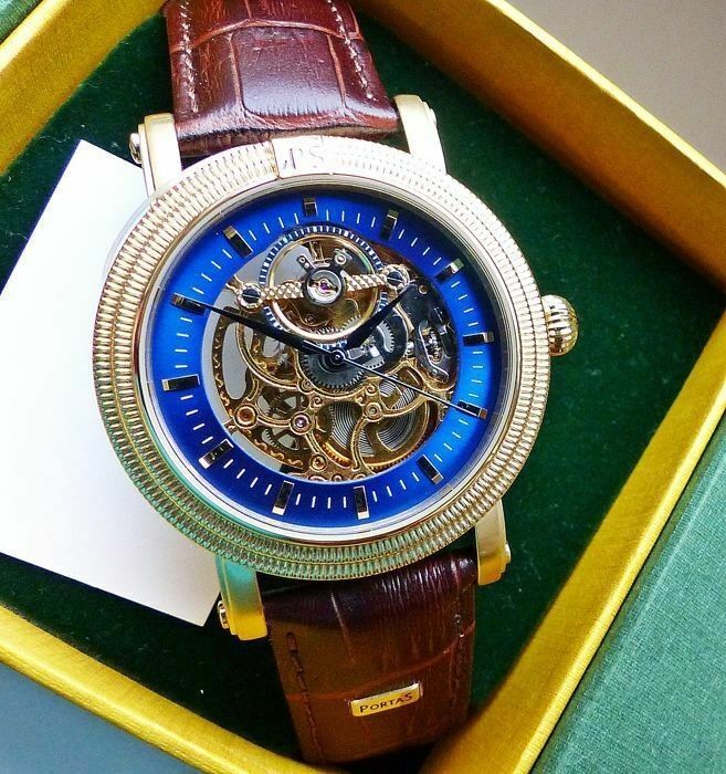 Hersteller : Portas Modell Werdau Gold-Blau Skeleton Automatik mit grosser zentraler Sekunde, offener sichtbarer Unruhe auf 12.00 und fein verziertem sichtbarem Automatik Uhrwerk, Lünette mit Portas Logo Uhrwerk : Automatisch - Mechanisch mit 24Jewels Material Gehäuse : Edelstahl vergoldet und gehär