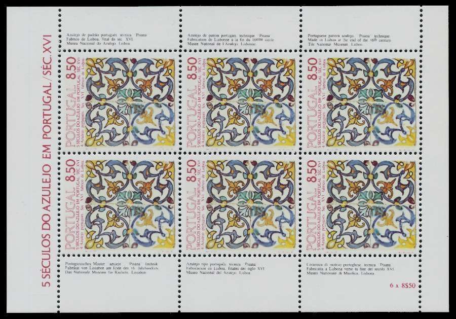 PORTUGAL Nr 1548 postfrisch KLEINBG 500 Jahre Azulejos in Portugal 2.55€ incl. MwSt: Differenzbesteuert zzgl. Versandkosten Bestell-Nr.: S3CBD7E Katalog-Nr: MICHEL (1548) Katalogpreis: 7 EUR Qualität: Normal Erhaltung: Postfrisch ** Einheit: Kleinbogen Bogenlage: Gummierung: Geprüft: Versandums