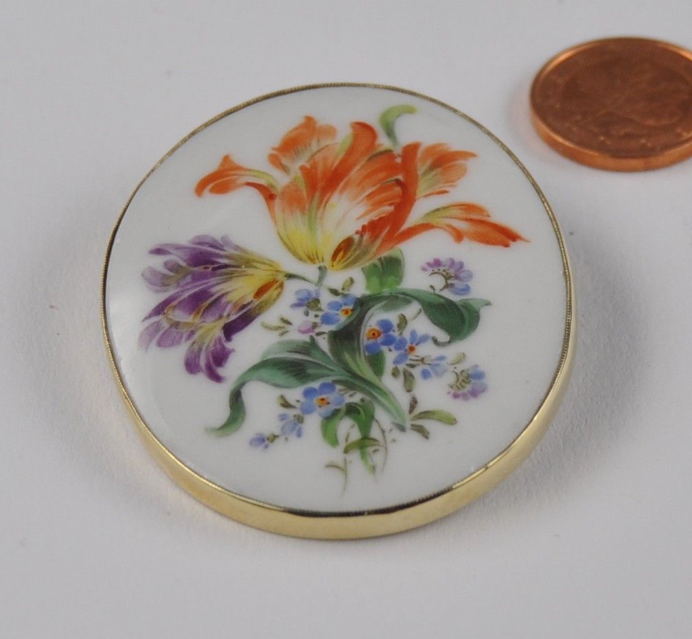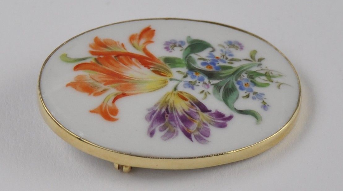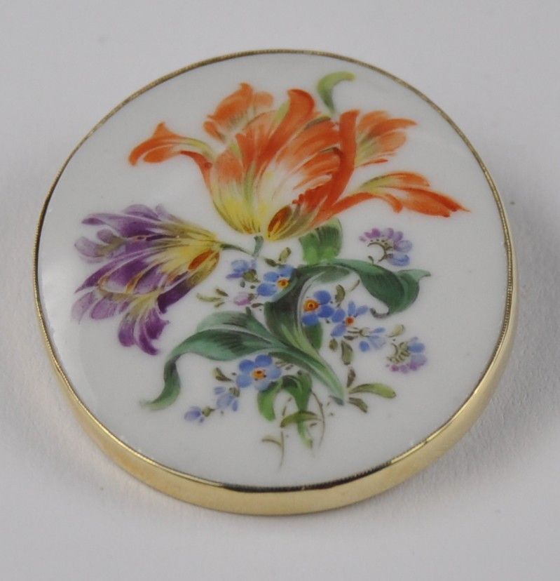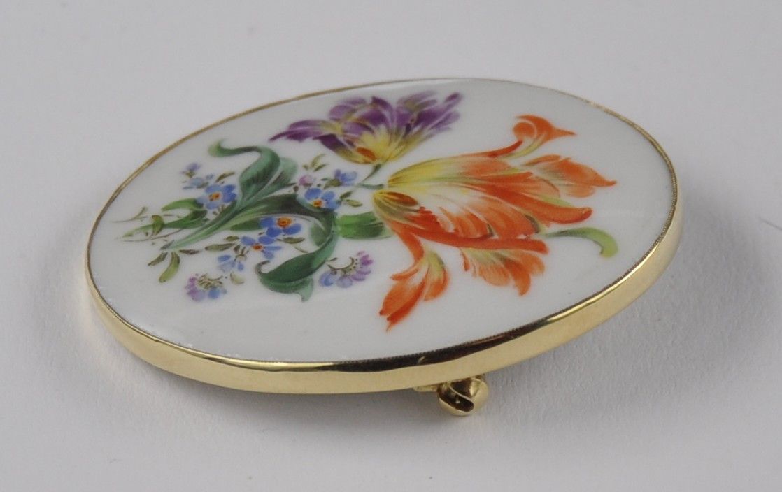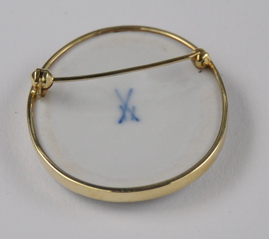 Porzellan Blumen Brosche Nadel groß 585 Gold Meissen Schwerter Neu wertig