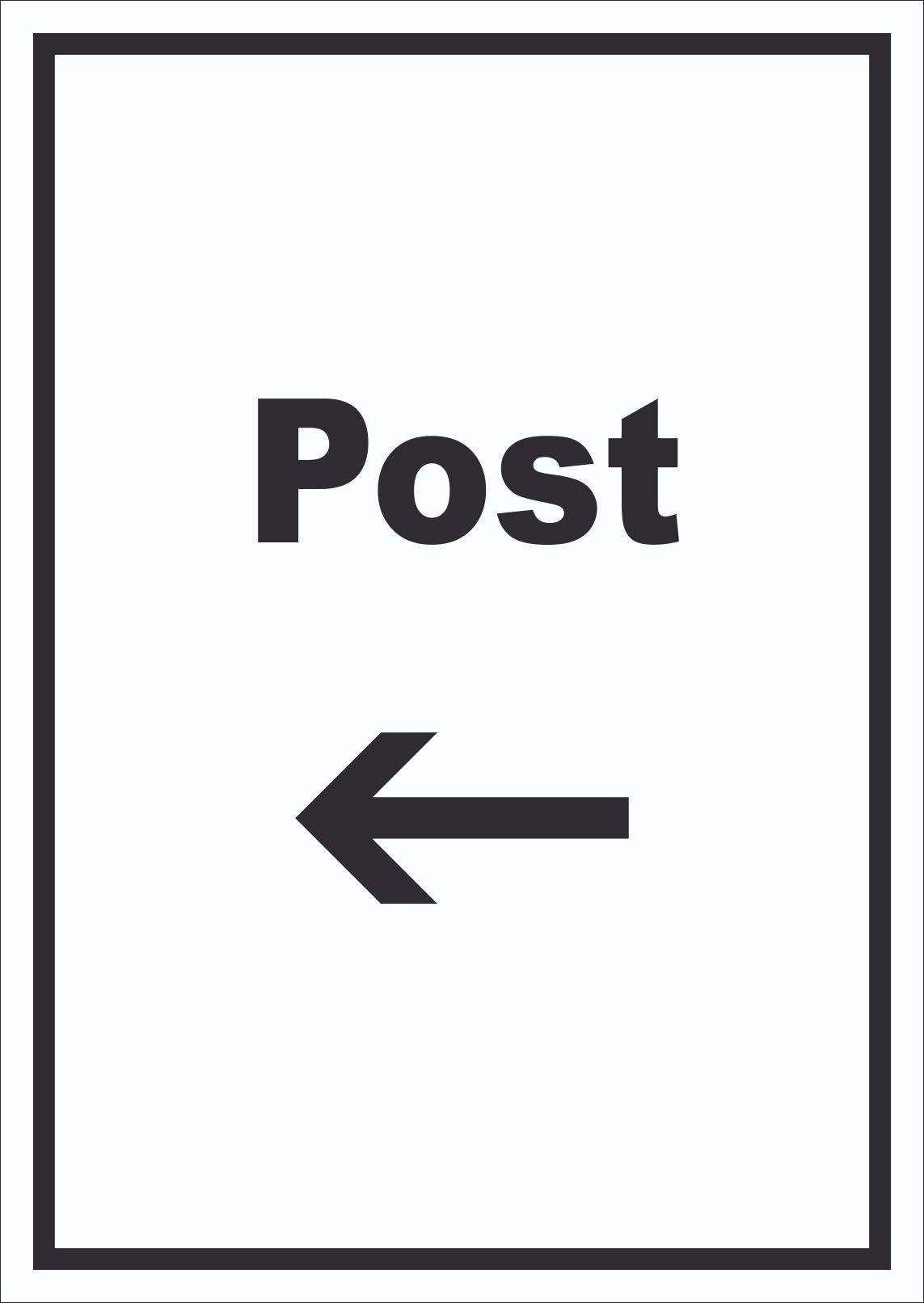 Post Schild mit Text und Richtungspfeil links Annahme Brief Paket hochkant
