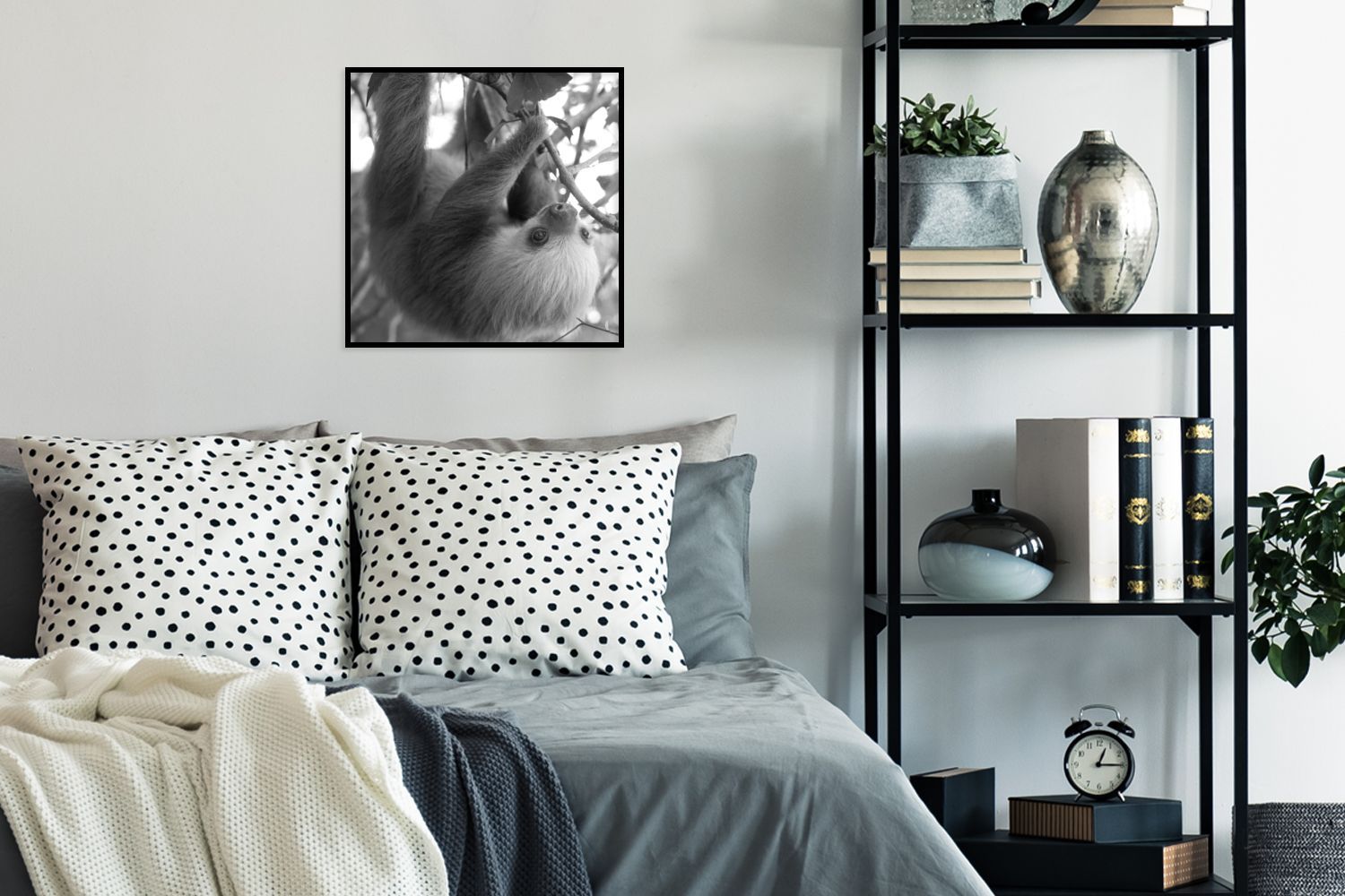 Poster - 40x40 cm - Baby-Faultier im Regenwald von Costa Rica in schwarz und weiß
