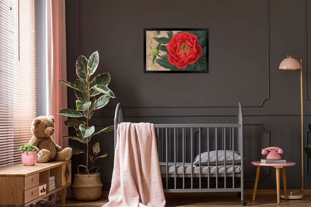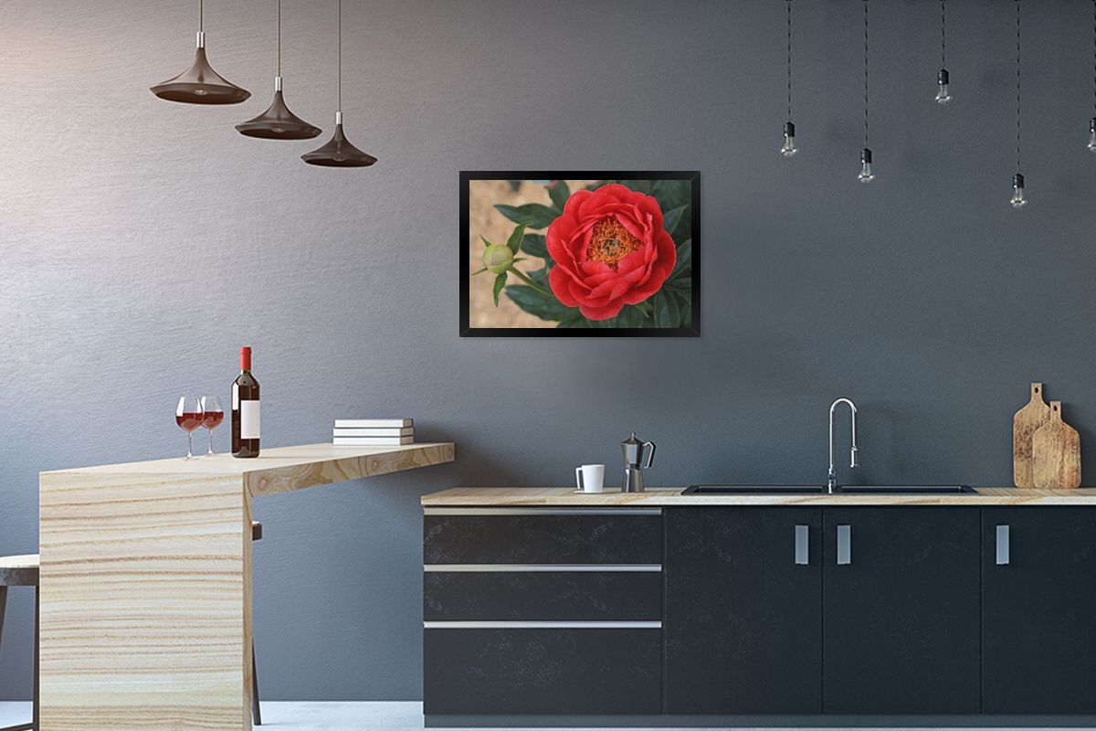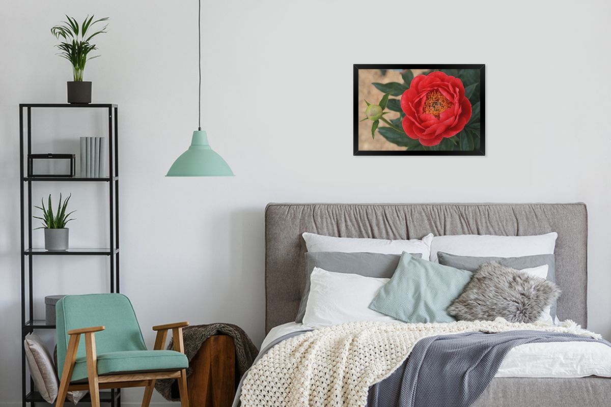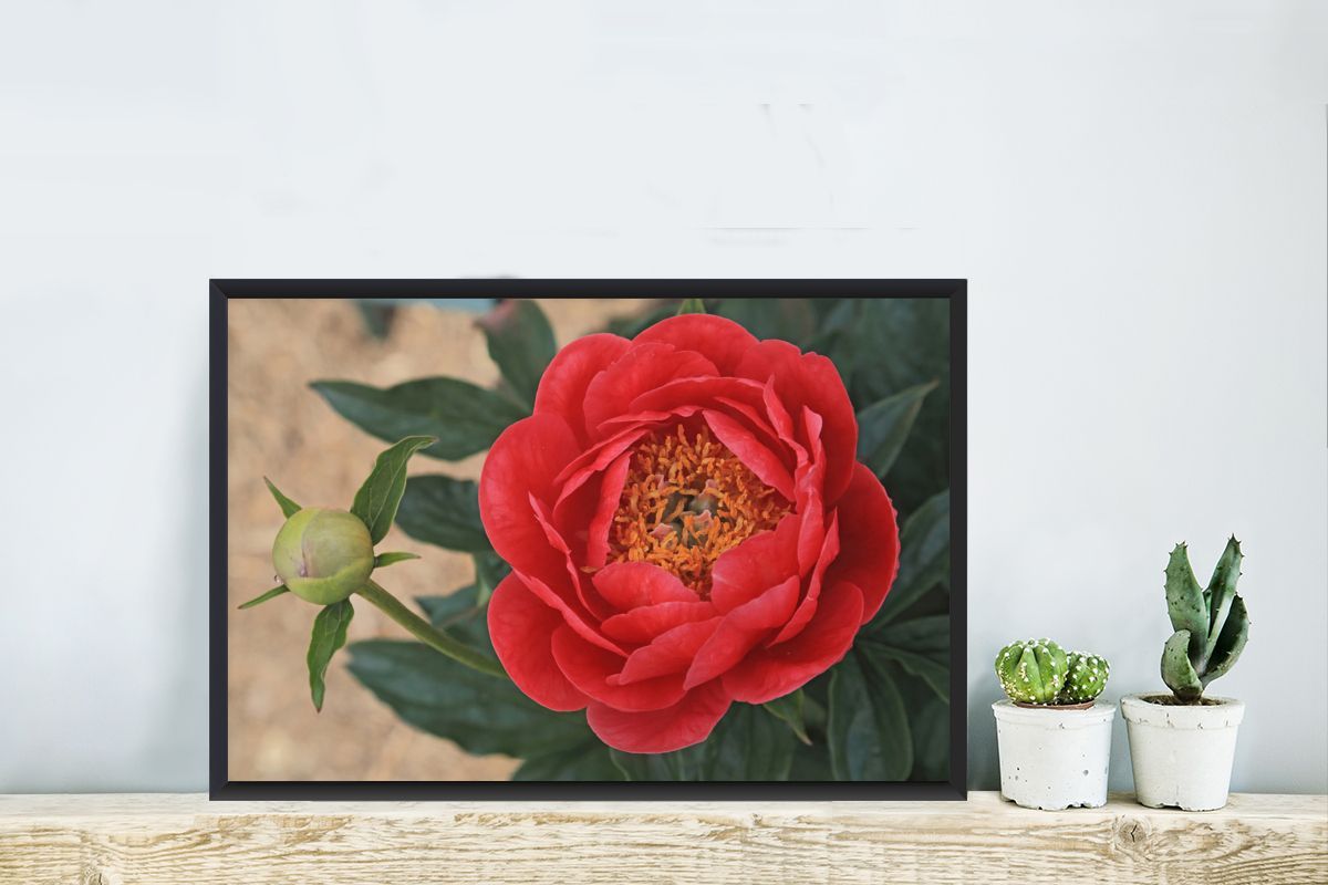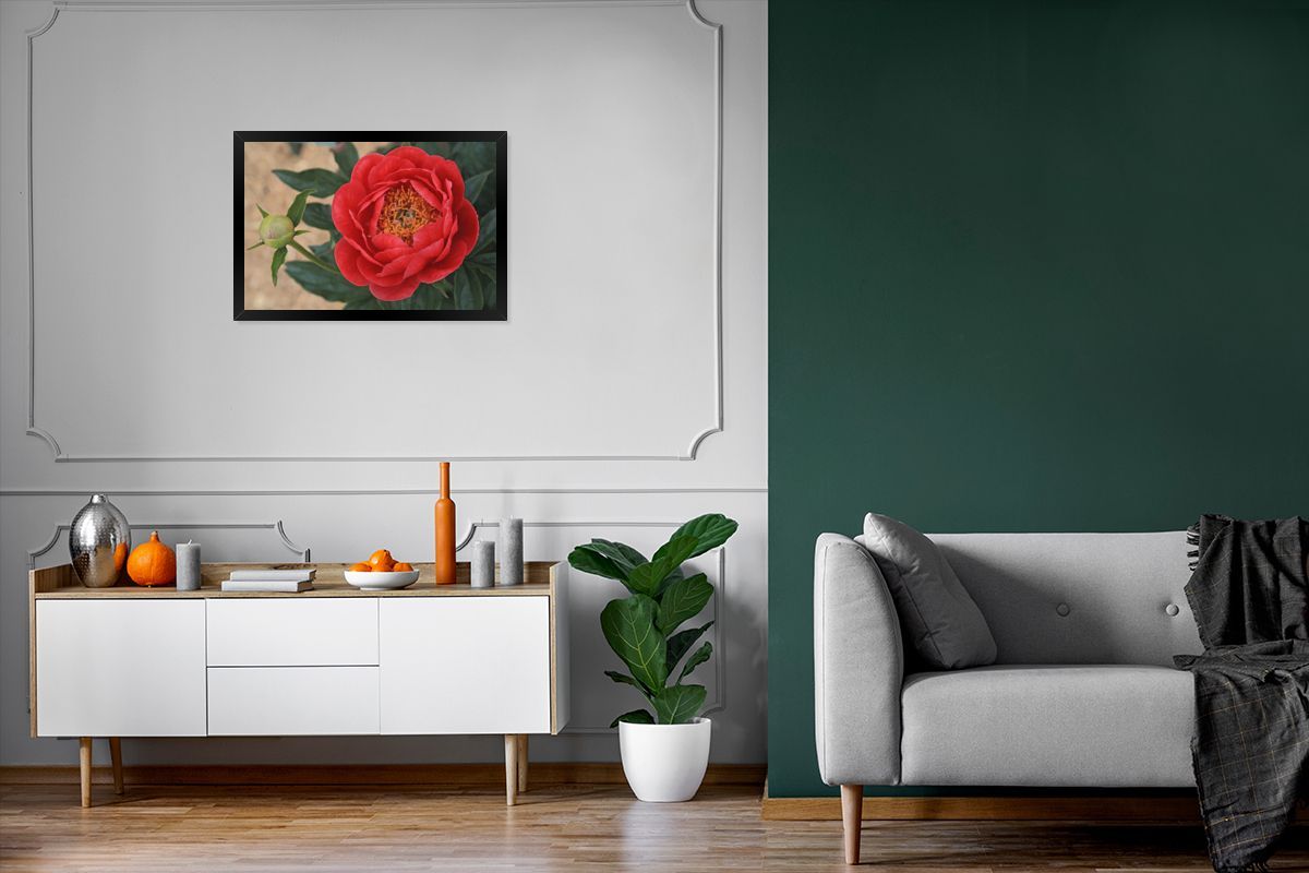 Poster - 60x40 cm - Eine rote Pfingstrose und eine Knospe