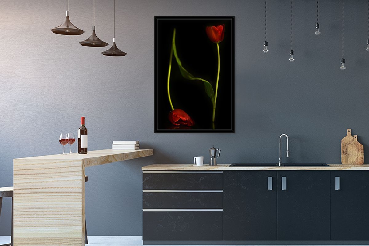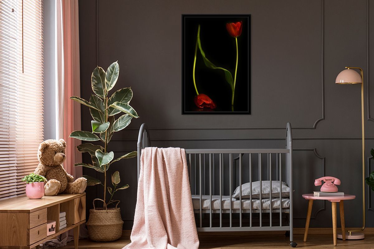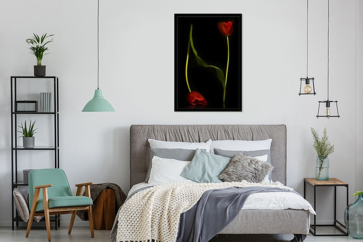 Poster - 60x90 cm - Zwei rote Tulpen auf einem schwarzen Hintergrund