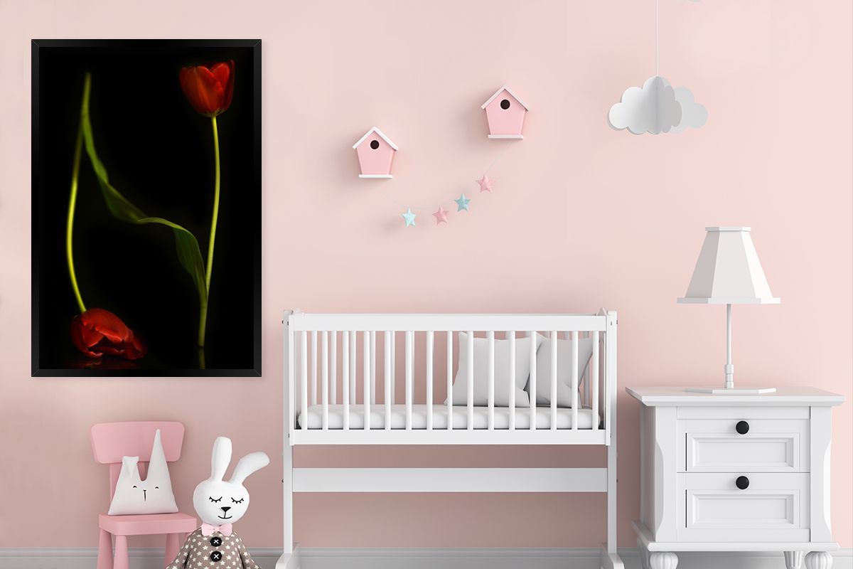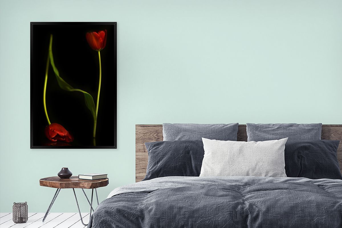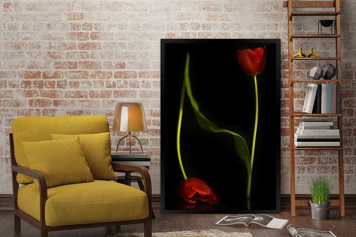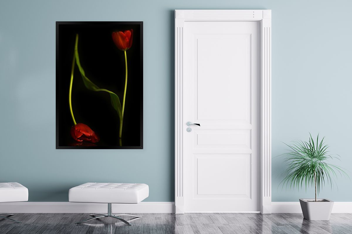 Poster - 80x120 cm - Zwei rote Tulpen auf einem schwarzen Hintergrund