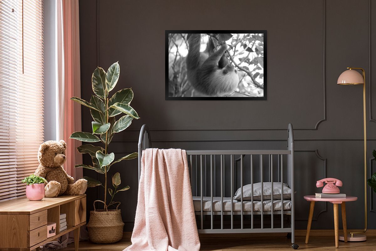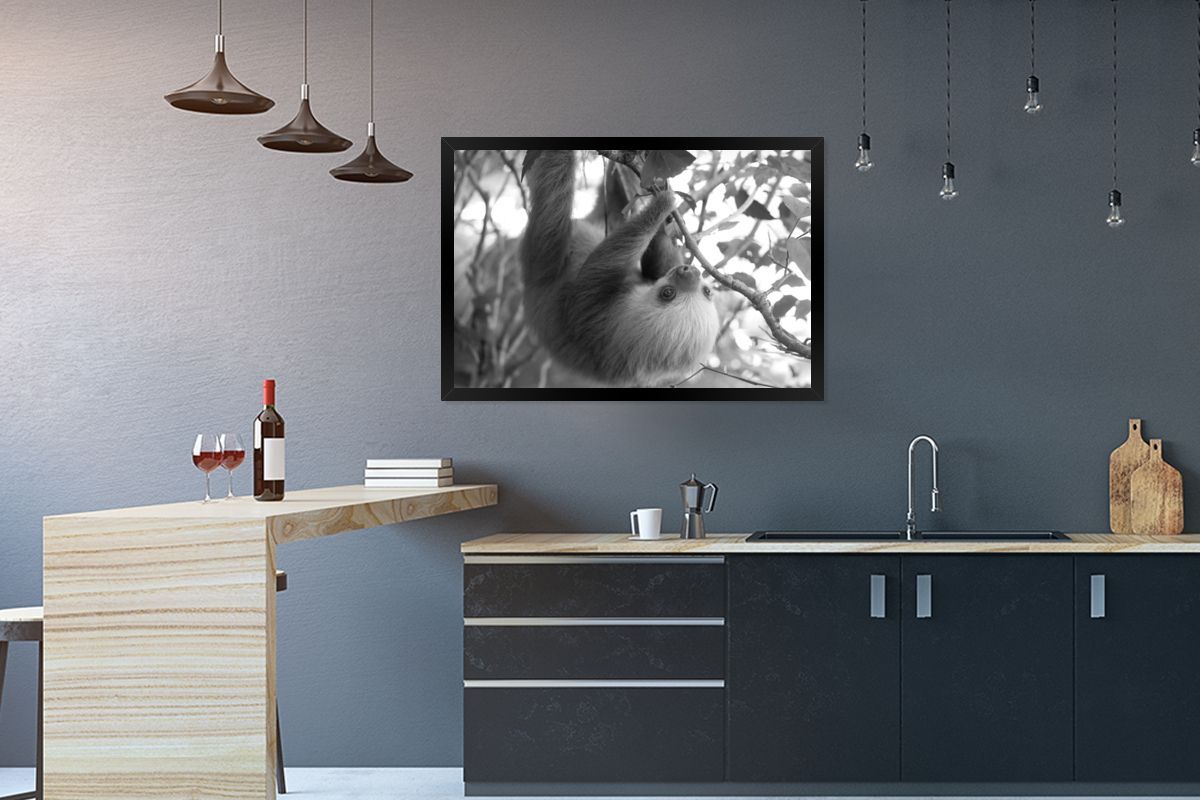 Poster - 90x60 cm - Baby-Faultier im Regenwald von Costa Rica in schwarz und weiß