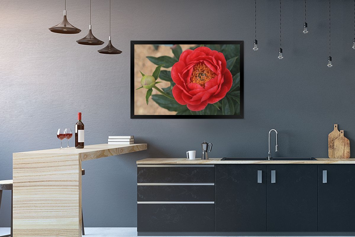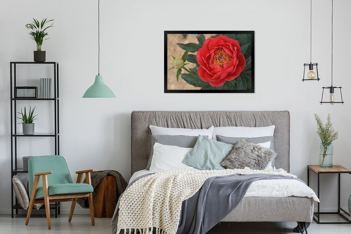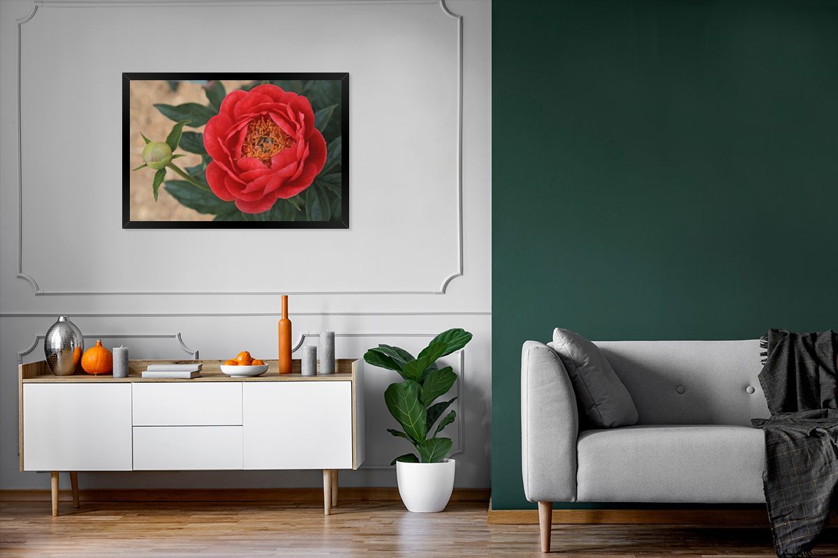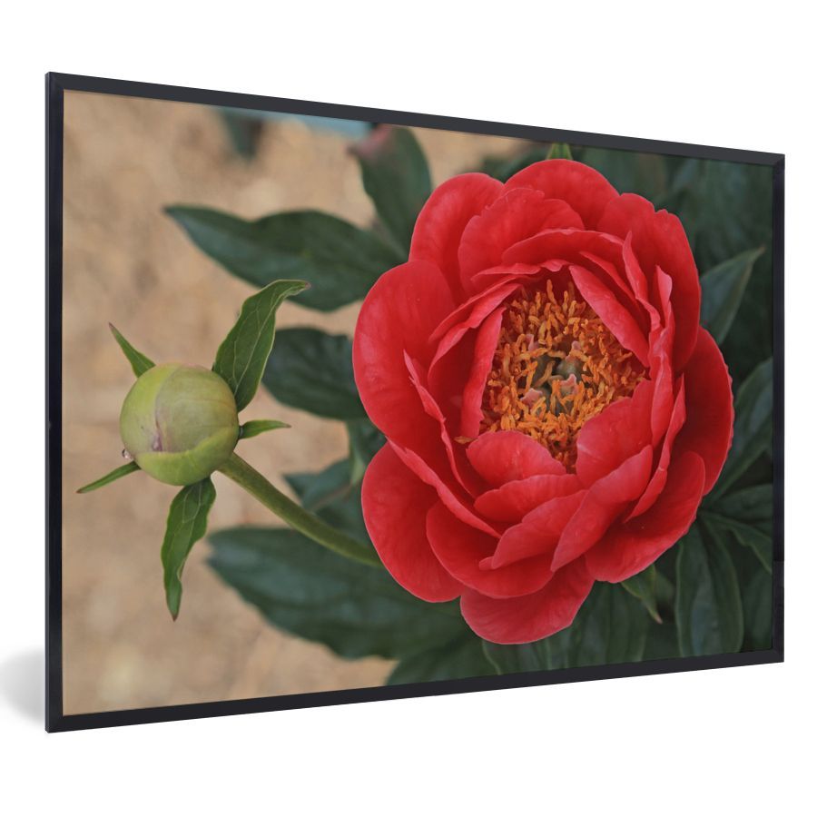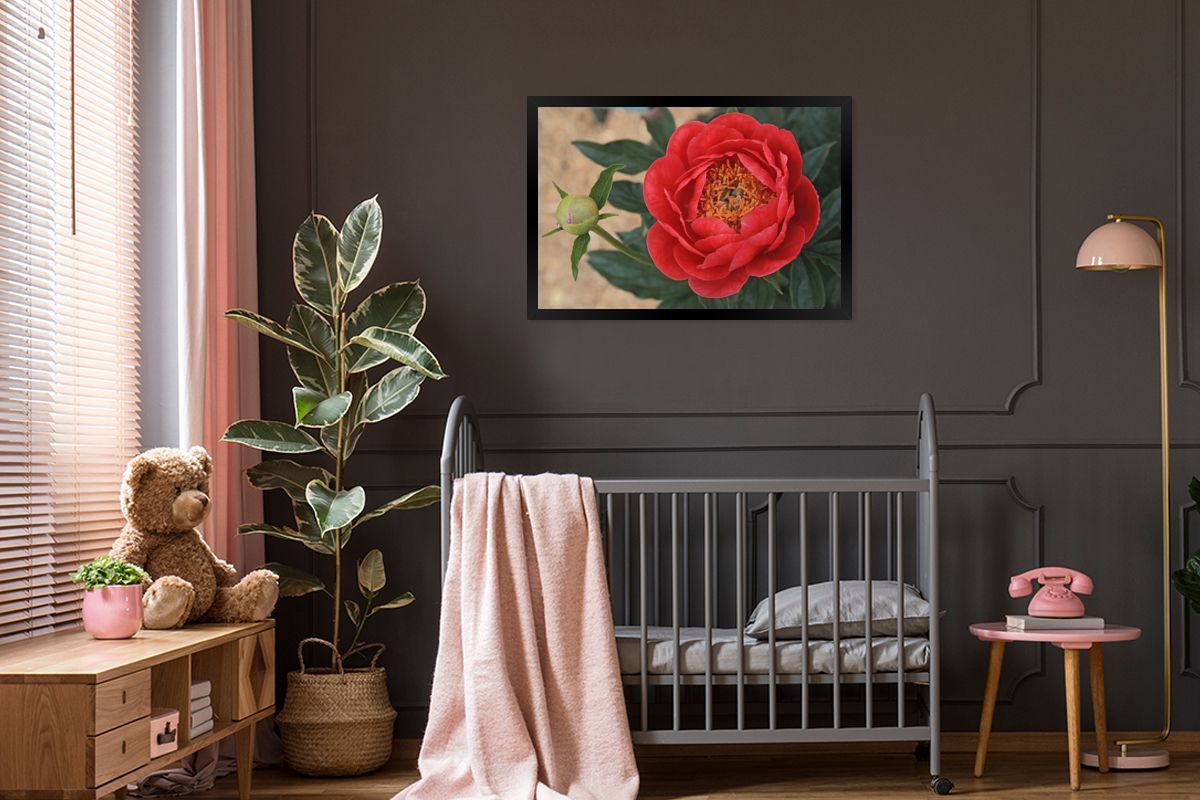Poster - 90x60 cm - Eine rote Pfingstrose und eine Knospe